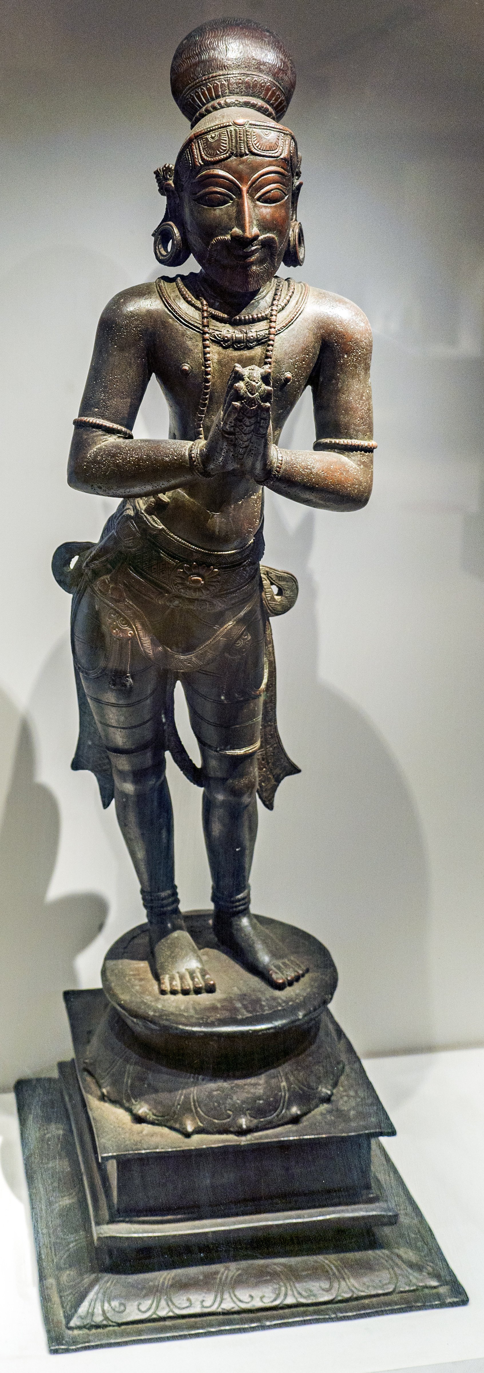 A royal saint or devotee having flowing moustache and a well-trimmed beard stands on a double-lotus pedestal mounted on a square block with a flat base. Both the hands are joined against the breast in anjali-mudra. A dagger is tucked to the girdle on the right.