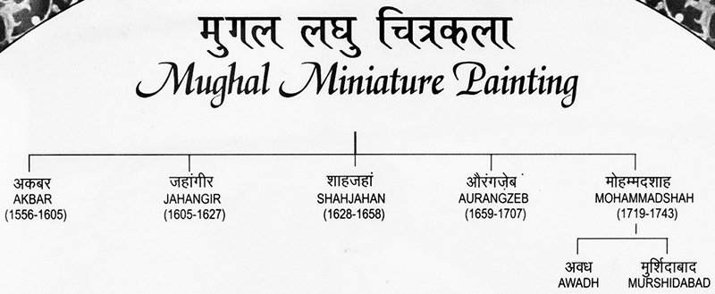 मुगल लघु चित्रकला:—अकबर; जहांगीर; शाहजहां; औरंगज़ेब; मोहम्मदशाह; अवध; मुर्शिदाबाद.