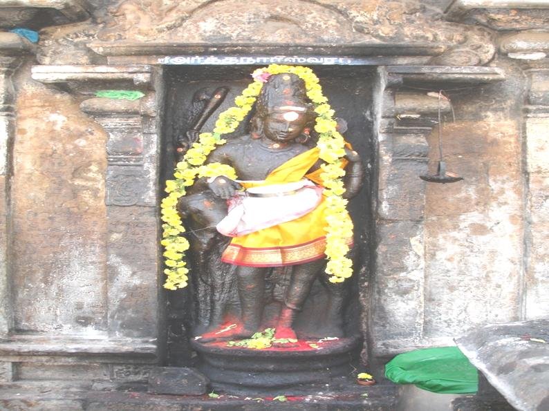 As we further go around the Prakaram around the Garbha Graha, we come to Brahma’s idol which is facing the north. Brahma the creator is standing erect with his feet in Samapada Sthana, facing the front. His Kati and Urah are in Sama and Parsva is unbent. His main right hand is in Abhaya Hasta and the second right hand is holding Aksamalai. His main left hand is in Uru Hasta and his second left hand is holding Kamandalu. The two upper right and left hands seem to be in Kartarimukh a or Prayoga Mudra. Three of his heads are clearly visible.