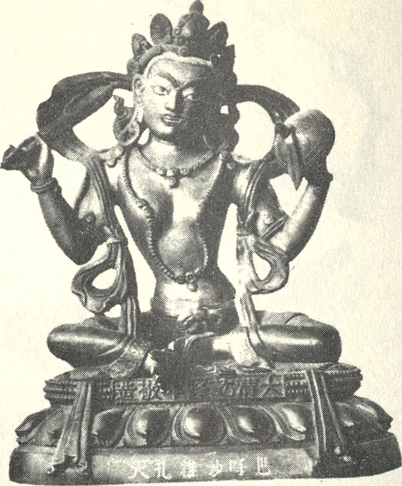 This sculpture depicts Mālyā (fo-mu) from the Pao-hsiang Lou pantheon: a Lama temple situated in the garden of the Tz’u-ning palace in the Forbidden City (Gu-gong) at Peiping. It bears the serial-number 3B27: the first digit means that this image stands at the third of the six side chapels (from north to south); the letter B indicates that this statuette is situated in the boxes in the cabinets to the right (south) of the central altar. This image further bears number 396 which can be used to look it up in the Chinese index of the source book.