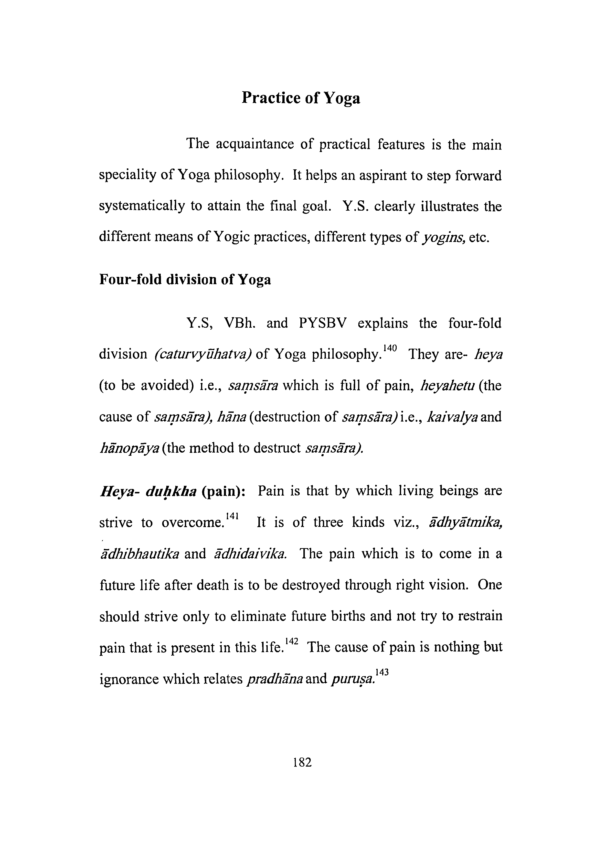 Practice of Yoga The acquaintance of practical features is the main speciality of Yoga philosophy. It helps an aspirant to step forward systematically to attain the final goal. Y.S. clearly illustrates the different means of Yogic practices, different types of yogins, etc. Four-fold division of Yoga Y.S, VBh. and PYSBV explains the four-fold division (caturvyūhatva) of Yoga philosophy. They are- heya 140 (to be avoided) i.e., samsara which is full of pain, heyahetu (the