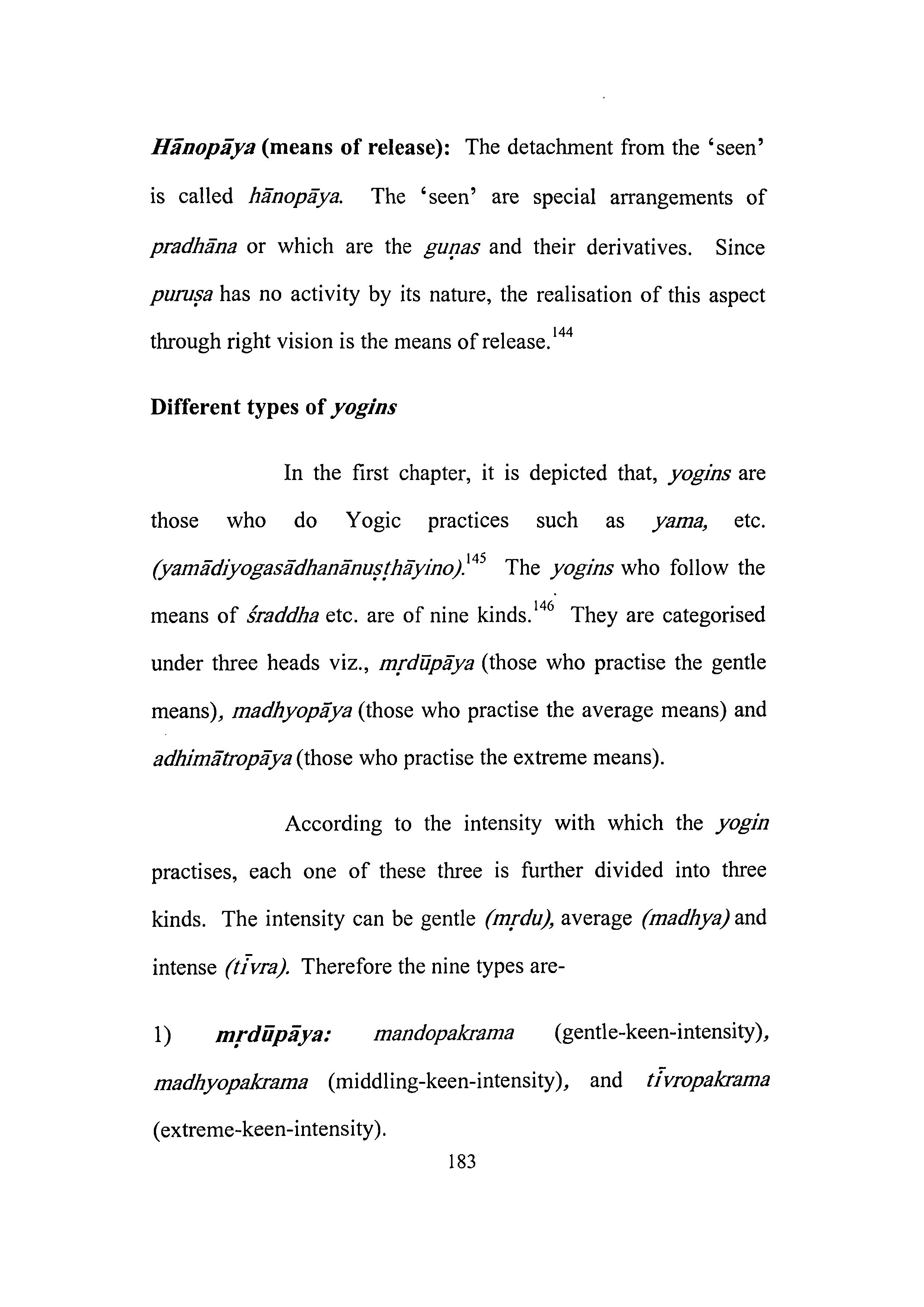 Hānopāya (means of release): The detachment from the 'seen' is called hanopāya. The 'seen' are special arrangements of pradhāna or which are the guṇas and their derivatives. Since puruṣa has no activity by its nature, the realisation of this aspect through right vision is the means of release." Different types of yogins In the first chapter, it is depicted that, yogins are those who do Yogic Yogic practices such as yama, etc. (yamādiyogasādhanānuṣṭhāyino). The yogins who follow the 145 146 means of śraddha etc. are of nine kinds. They are categorised