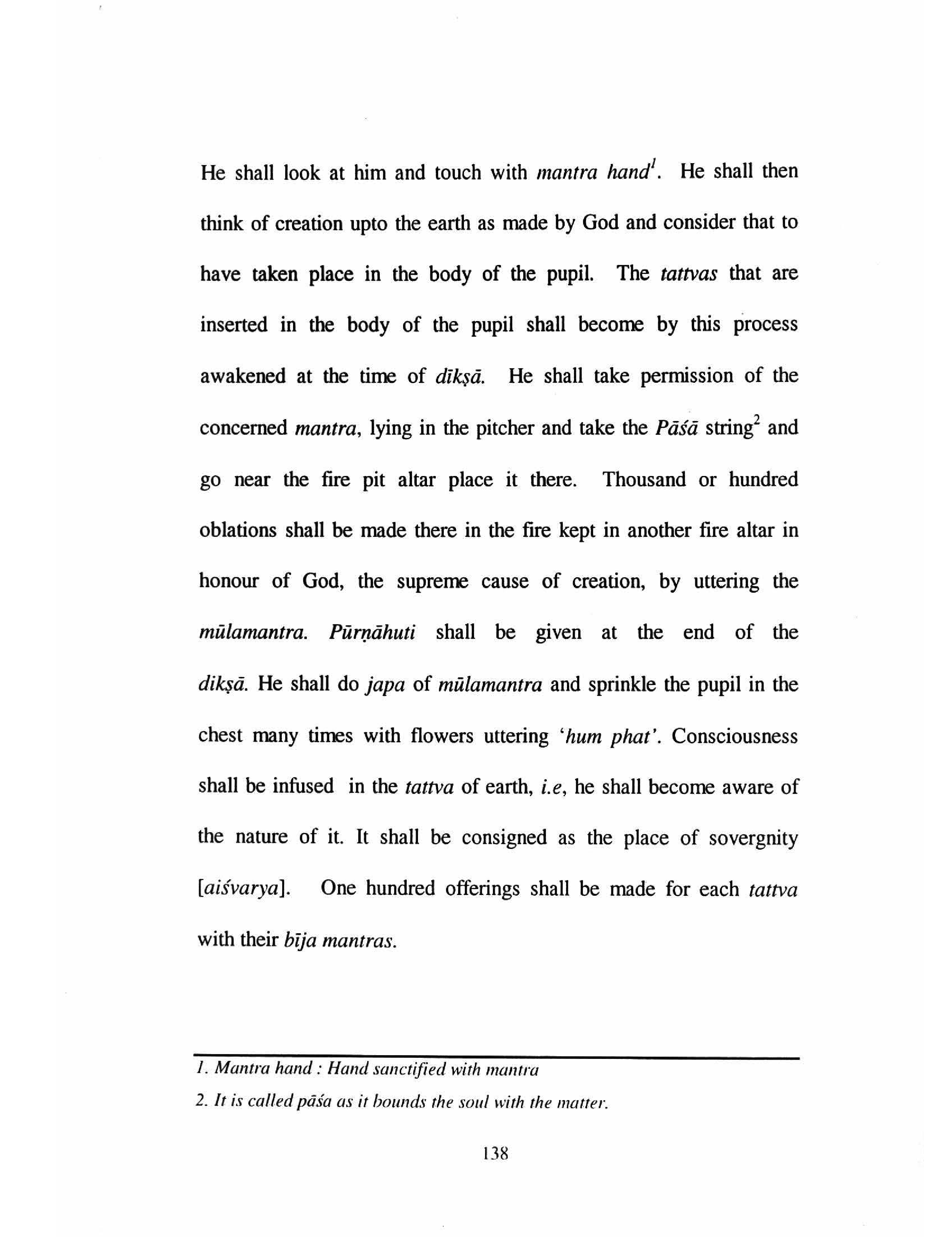 He shall look at him and touch with mantra hand'. He shall then think of creation upto the earth as made by God and consider that to have taken place in the body of the pupil. The tattvas that are inserted in the body of the pupil shall become by this process awakened at the time of dikṣā. He shall take permission of the concerned mantra, lying in the pitcher and take the Pāśā string² and go near the fire pit altar place it there. Thousand or hundred oblations shall be made there in the fire kept in another fire altar in honour of God, the supreme cause of creation, by uttering the mūlamantra. Pūrṇāhuti shall be given at the end of the dikṣā. He shall do japa of mūlamantra and sprinkle the pupil in the chest many times with flowers uttering 'hum phat'. Consciousness shall be infused in the tattva of earth, i.e, he shall become aware of the nature of it. It shall be consigned as the place of sovergnity [aiśvarya]. One hundred offerings shall be made for each tattva with their bīja mantras. 1. Mantra hand: Hand sanctified with mantra 2. It is called pāśa as it bounds the soul with the matter. 138
