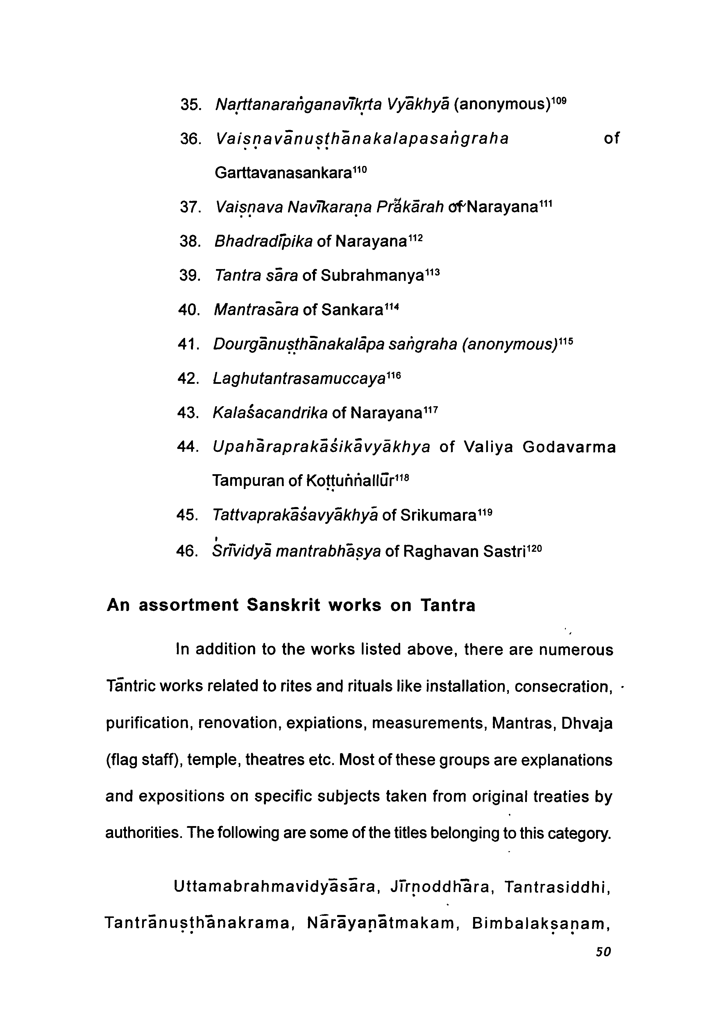 . Naṛttanaranganavīkṛta Vyākhyā (anonymous) 109 36. Vaiṣṇavānuṣṭhānakalapasangraha Garttavanasankara110 37. Vaisnava Navīkaraṇa Prākārah of Narayana111 38. Bhadradípika of Narayana 112 39. Tantra sāra of Subrahmanya 113 40. Mantrasara of Sankara 114 41. Dourgānuṣṭhānakalāpa sangraha (anonymous) 115 42. Laghutantrasamuccaya 116 43. Kalaśacandrika of Narayana117 of 44. Upahāraprakāśikāvyākhya of Valiya Godavarma Tampuran of Koṭṭunnallur118 45. Tattvaprakāśavyākhyā of Srikumara 119 46. Srividyā mantrabhasya of Raghavan Sastri 120 An assortment Sanskrit works on Tantra In addition to the works listed above, there are numerous Tantric works related to rites and rituals like installation, consecration, · purification, renovation, expiations, measurements, Mantras, Dhvaja (flag staff), temple, theatres etc. Most of these groups are explanations and expositions on specific subjects taken from original treaties by authorities. The following are some of the titles belonging to this category. Uttamabrahmavidyāsāra, Jīrṇoddhara, Tantrasiddhi, Tantranuṣṭhānakrama, Nārāyaṇātmakam, Bimbalakṣaṇam, 50