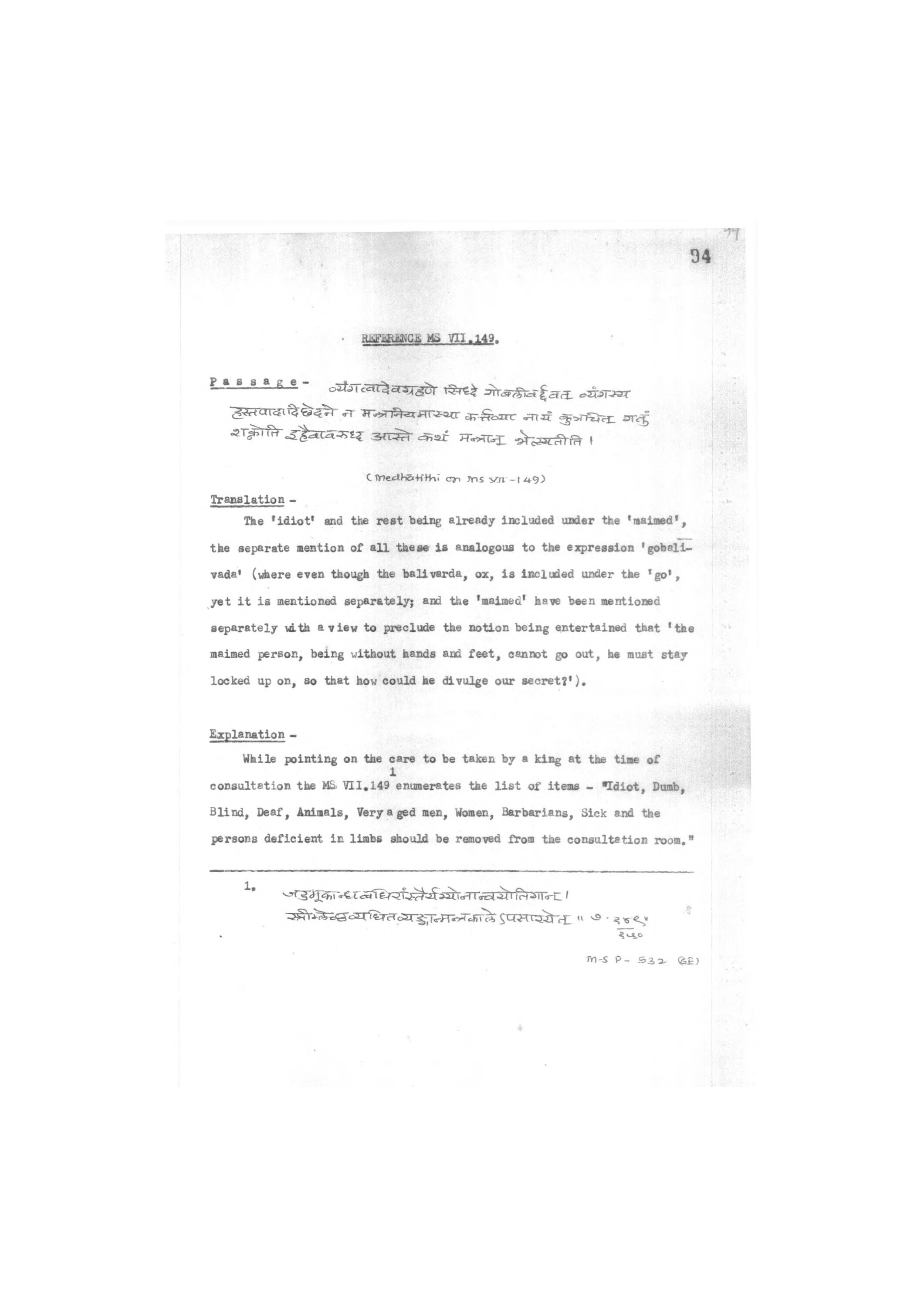 REFERENCE MS VII. 149. Passage - व्यंगत्वादेवग्रहणे सिध्दे गोबलीवर्द्धवत् व्यगस्य हस्तपादादि छेदने न मन्त्रनियमास्था कर्त्तव्या नायं कुत्रचित् गर्नु शक्नोति इहैवावरुद्ध आस्ते कथं मन्त्रान् भेत्स्यतीति । [vyaṃgatvādevagrahaṇe sidhde gobalīvarddhavat vyagasya hastapādādi chedane na mantraniyamāsthā karttavyā nāyaṃ kutracit garnu śaknoti ihaivāvaruddha āste kathaṃ mantrān bhetsyatīti | ] Ciedhatithi on ns VI -149) 94 Translation -