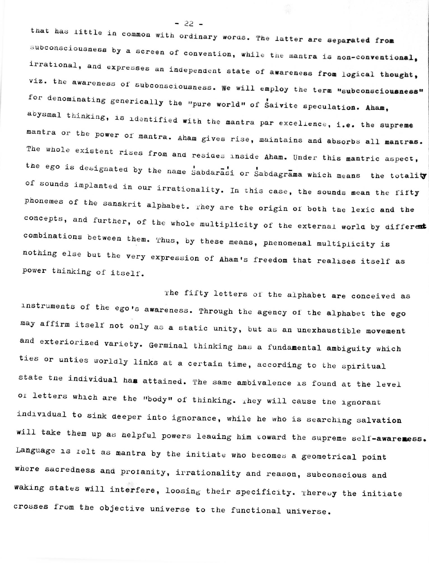 subconsciousness by a screen of convention, while the mantra is non-conventional,