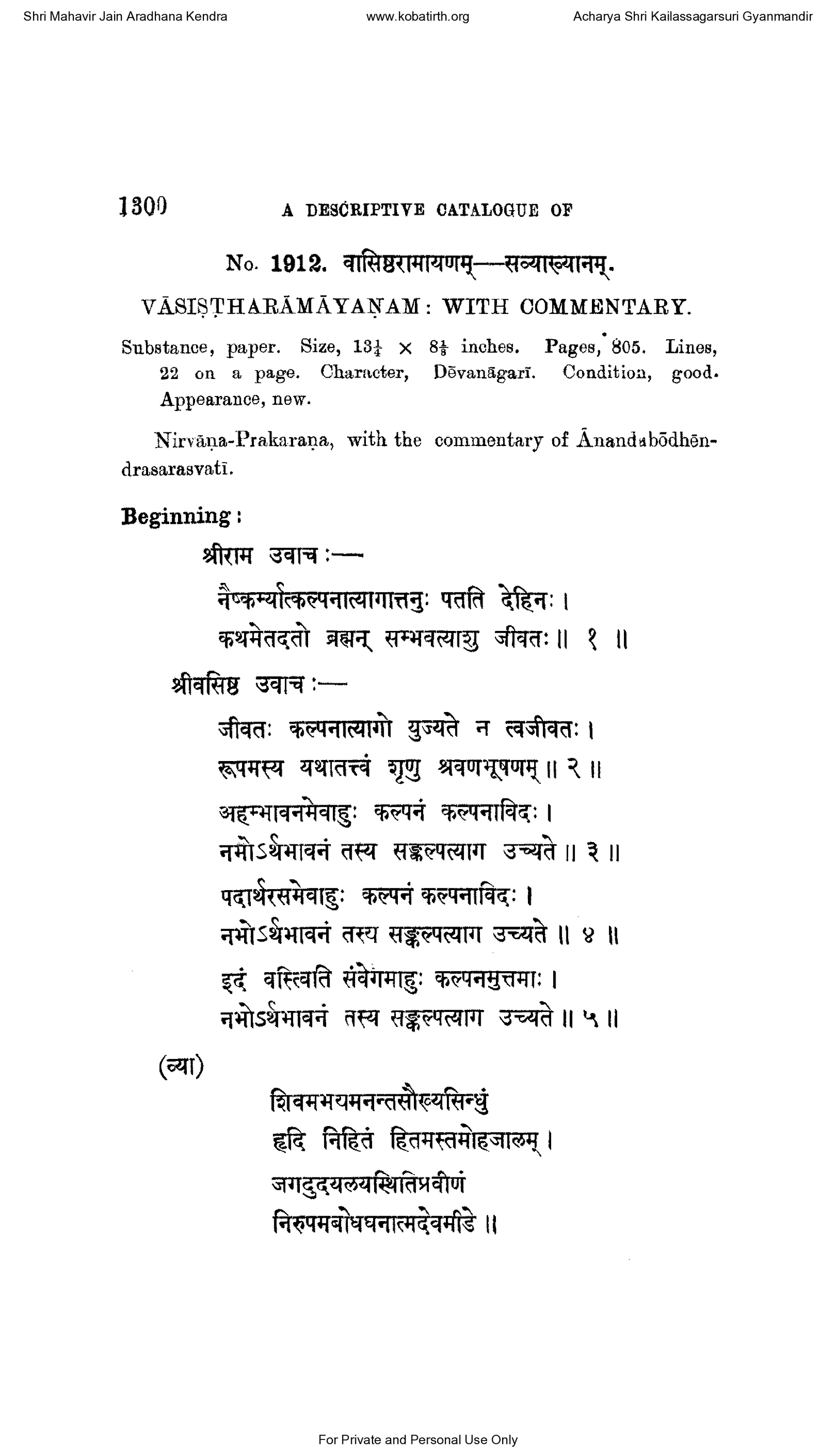 No. 1912 वासिष्ठरामायणम् — सव्याख्यानम्.