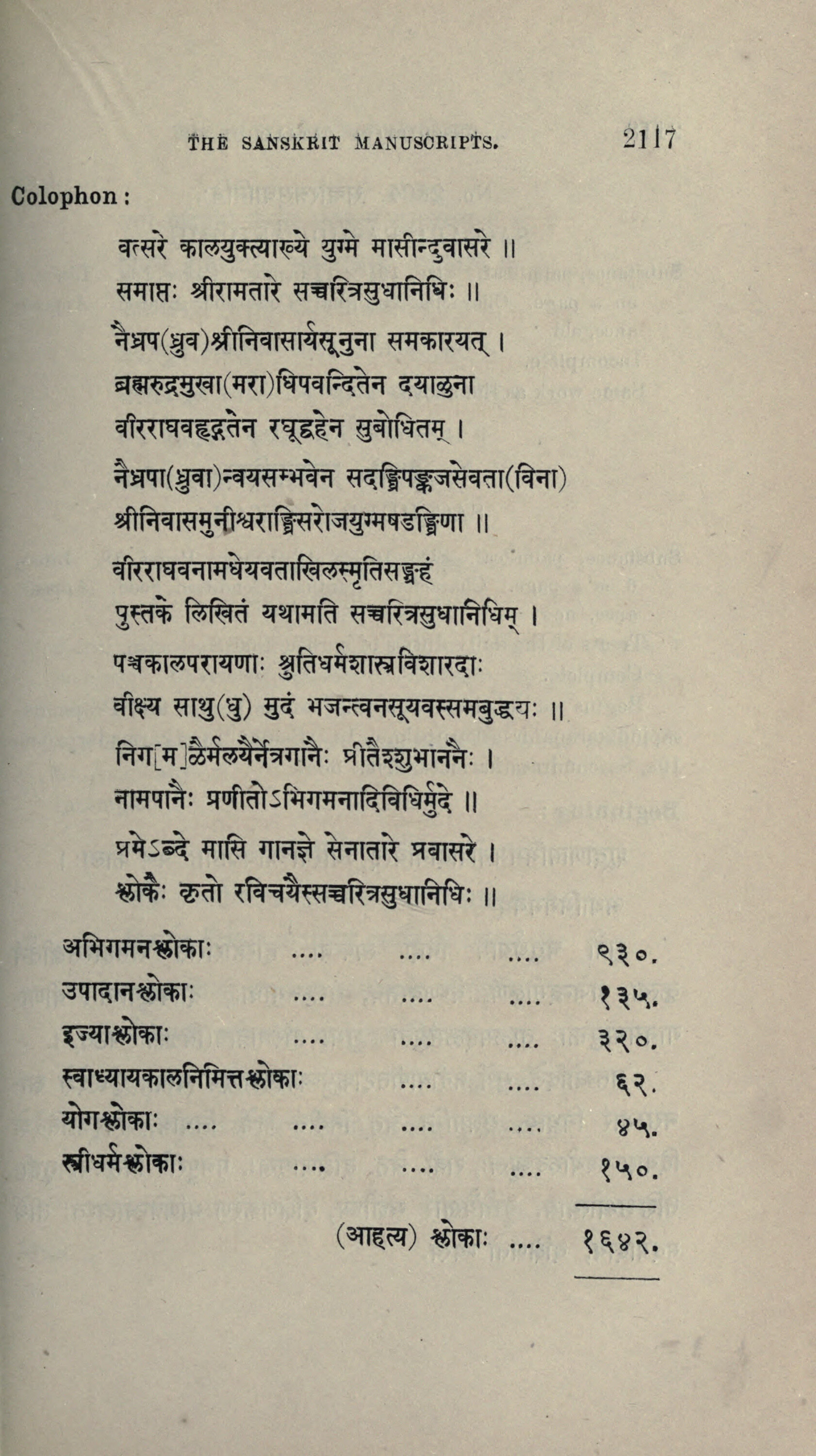 Colophon : THE SANSKRIT MANUSCRIPTS. वत्सरे कालयुक्त्याख्ये युग्मे मासीन्दुवासरे || समाप्तः श्रीरामतारे सच्चरित्रसुधानिधिः || नैधप (ध्रुव) श्रीनिवासार्यसूनुना समकारयत् । ब्रह्मरुद्रमुखा (मरा) धिपवन्दितेन दयाळुना वीरराघवद्भतेन रघूहेन सुबोधितम् । नैधपा (ध्रुवा) न्वयसम्भवेन सदङ्घ्रिपङ्कजसेवता (विना) श्रीनिवासमुनीश्वराङ्घ्रिसरोजयुग्मषडङ्गिणा || वीरराघवनामधेयवताखिलस्मृतिसङ्घहं पुस्तके लिखितं यथामति सच्चरित्रसुधानिधिम् । पञ्चकालपरायणाः श्रुतिधर्मशास्त्रविशारदाः वीक्ष्य साधु (धु) मुदं भजन्त्वनसूयवस्समबुद्धयः ॥ निग[म] कैर्मलयैर्नेत्रगानैः प्रीतैश्शुभाननैः । [vatsare kālayuktyākhye yugme māsīnduvāsare || samāptaḥ śrīrāmatāre saccaritrasudhānidhiḥ || naidhapa (dhruva) śrīnivāsāryasūnunā samakārayat | brahmarudramukhā (marā) dhipavanditena dayāḷunā vīrarāghavadbhatena raghūhena subodhitam | naidhapā (dhruvā) nvayasambhavena sadaṅghripaṅkajasevatā (vinā) śrīnivāsamunīśvarāṅghrisarojayugmaṣaḍaṅgiṇā || vīrarāghavanāmadheyavatākhilasmṛtisaṅghahaṃ pustake likhitaṃ yathāmati saccaritrasudhānidhim | pañcakālaparāyaṇāḥ śrutidharmaśāstraviśāradāḥ vīkṣya sādhu (dhu) mudaṃ bhajantvanasūyavassamabuddhayaḥ || niga[ma] kairmalayairnetragānaiḥ prītaiśśubhānanaiḥ | ] 2117 नामपानैः प्रणीतोऽभिगमनादिविधिर्मुदे ||