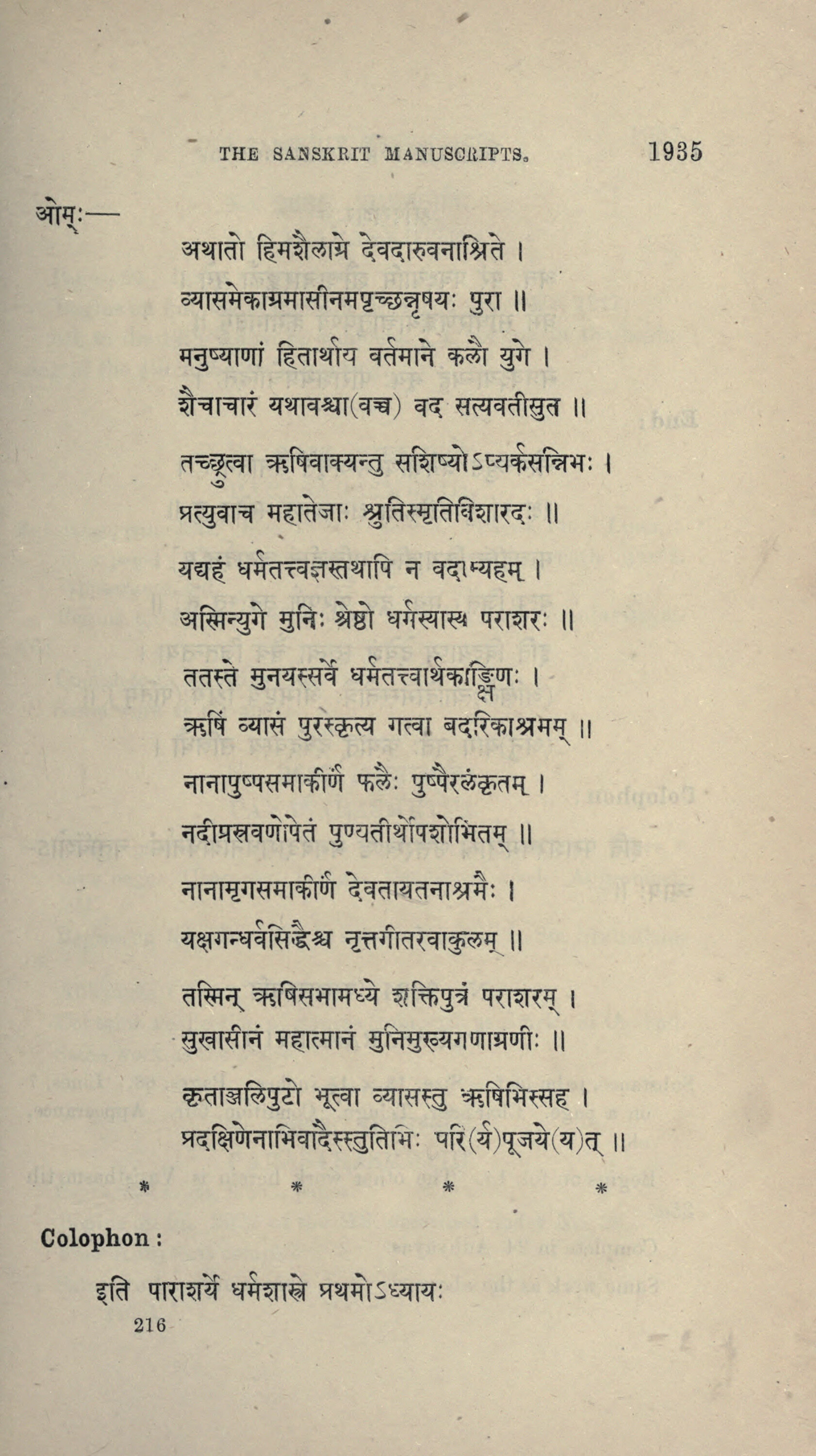 ओम्ः - [omḥ - ] THE SANSKRIT MANUSCRIPTS. अथातो हिमशैलाग्रे देवदारुवनाश्रिते । व्यासमेकाग्रमासीनमपृच्छन्नृषयः पुरा ॥ मनुष्याणां हितार्थाय वर्तमाने कलौ युगे । शैचाचारं यथावश्चा (वच्च) वद सत्यवतीसुत | तच्छ्रुत्वा ऋषिवाक्यन्तु सशिष्योऽप्यर्कसन्निभः । प्रत्युवाच महातेजाः श्रुतिस्मृतिविशारदः ॥ यद्यहं धर्मतत्त्वज्ञस्तथापि न वदाम्यहम् । अस्मिन्युगे मुनिः श्रेष्ठो धर्मस्यास्य पराशरः ॥ ततस्ते मुनयस्सर्वे धर्मतत्त्वार्थकाङ्क्षिणः । ऋषिं व्यासं पुरस्कृत्य गत्वा बदरिकाश्रमम् || [athāto himaśailāgre devadāruvanāśrite | vyāsamekāgramāsīnamapṛcchannṛṣayaḥ purā || manuṣyāṇāṃ hitārthāya vartamāne kalau yuge | śaicācāraṃ yathāvaścā (vacca) vada satyavatīsuta | tacchrutvā ṛṣivākyantu saśiṣyo'pyarkasannibhaḥ | pratyuvāca mahātejāḥ śrutismṛtiviśāradaḥ || yadyahaṃ dharmatattvajñastathāpi na vadāmyaham | asminyuge muniḥ śreṣṭho dharmasyāsya parāśaraḥ || tataste munayassarve dharmatattvārthakāṅkṣiṇaḥ | ṛṣiṃ vyāsaṃ puraskṛtya gatvā badarikāśramam || ] 1935 नानापुष्पसमाकीर्ण फलैः पुष्पैरलंकृतम् ।