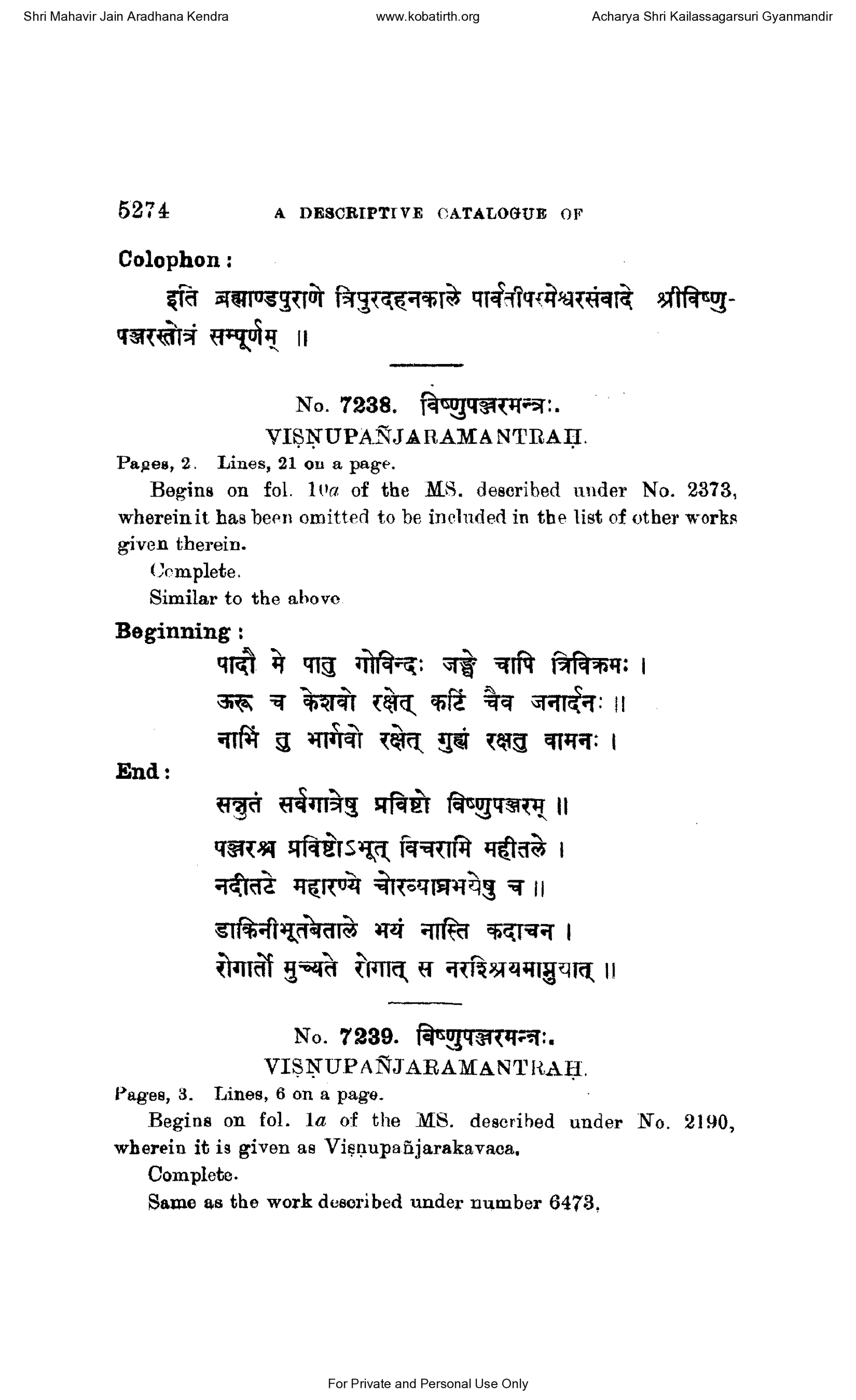 ] No. 7238. विष्णुपञ्जरमन्त्रः.