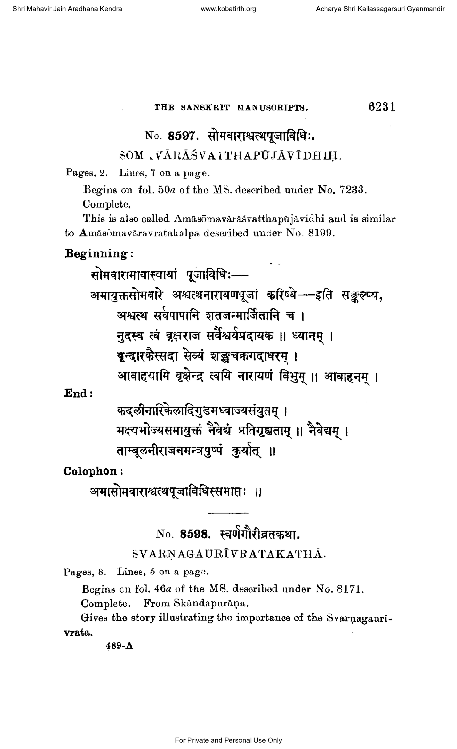 Shri Mahavir Jain Aradhana Kendra www.kobatirth.org Acharya Shri Kailassagarsuri Gyanmandir Pages, 2. THE SANSKRIT MANUSCRIPTS. No. 8597 सोमवाराश्वत्थपूजाविधिः. [somavārāśvatthapūjāvidhiḥ. ] • SOMVARĀŚVATTHAPŪJĀVĪDHIH. Lines, 7 on a page. Begins on fol. 50a of the MS. described under No. 7233. Complete. 6231 This is also called Amasoma värāśvattha pūjāvidhi and is similar