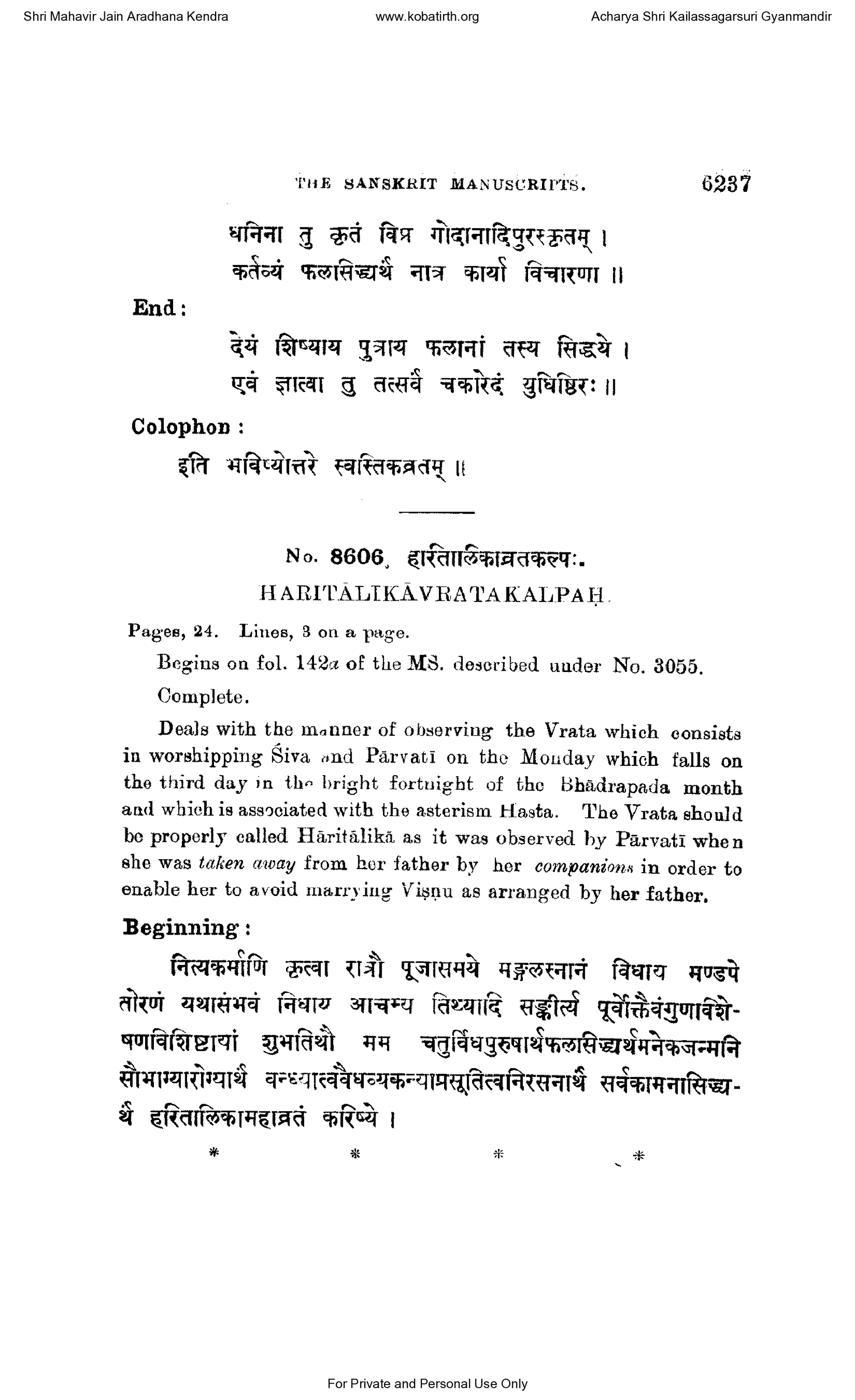 Shri Mahavir Jain Aradhana Kendra www.kobatirth.org Acharya Shri Kailassagarsuri Gyanmandir End : THE SANSKRIT MANUSCRIPTS. धनिना तु कृतं विप्र गोदानादिपुरस्कृतम् । कर्तव्यं फलसिद्ध्यर्थं नात्र कार्या विचारणा || देयं शिष्याय पुत्राय फलानां तस्य सिद्धये । एवं ज्ञात्वा तु तत्सर्वं चकारेदं युधिष्ठिरः || [dhaninā tu kṛtaṃ vipra godānādipuraskṛtam | kartavyaṃ phalasiddhyarthaṃ nātra kāryā vicāraṇā || deyaṃ śiṣyāya putrāya phalānāṃ tasya siddhaye | evaṃ jñātvā tu tatsarvaṃ cakāredaṃ yudhiṣṭhiraḥ || ] Colophon : इति भविष्योत्तरे स्वस्तिकव्रतम् ॥ [iti bhaviṣyottare svastikavratam || ] No. 8606, हरितालिकाव्रतकल्पः. [haritālikāvratakalpaḥ. ] HARITALIKAVRATAKALPAH. Pages, 24. Lines, 3 on a page. Begins on fol. 142% of the MS. described under No. 3055. Complete. 6237 Deals with the manner of observing the Vrata which consists