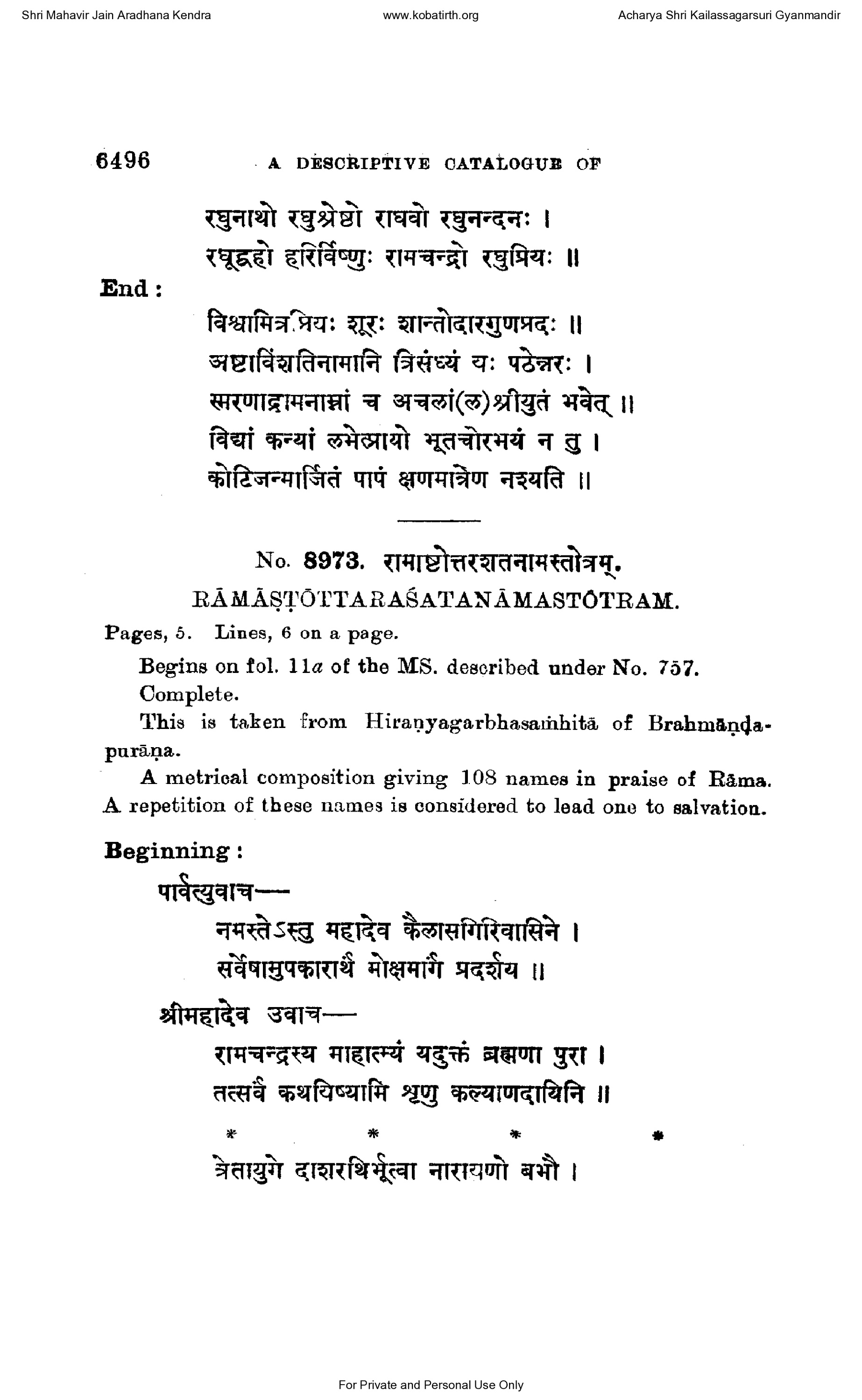 ] No. 8973. रामाष्टोत्तरशतनामस्तोत्रम्.