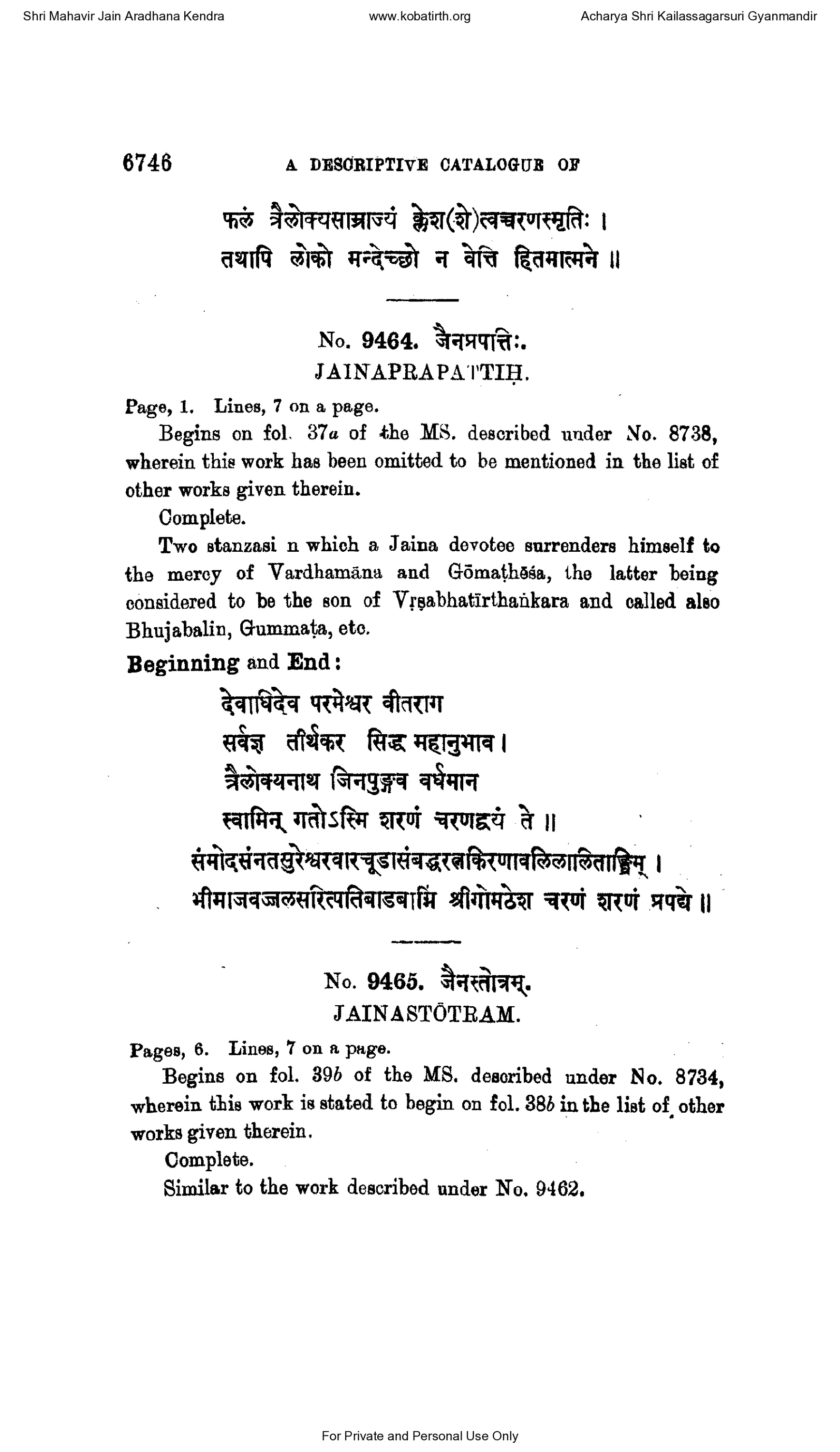 Shri Mahavir Jain Aradhana Kendra www.kobatirth.org Acharya Shri Kailassagarsuri Gyanmandir 6746 A DESCRIPTIVE CATALOGUE OF