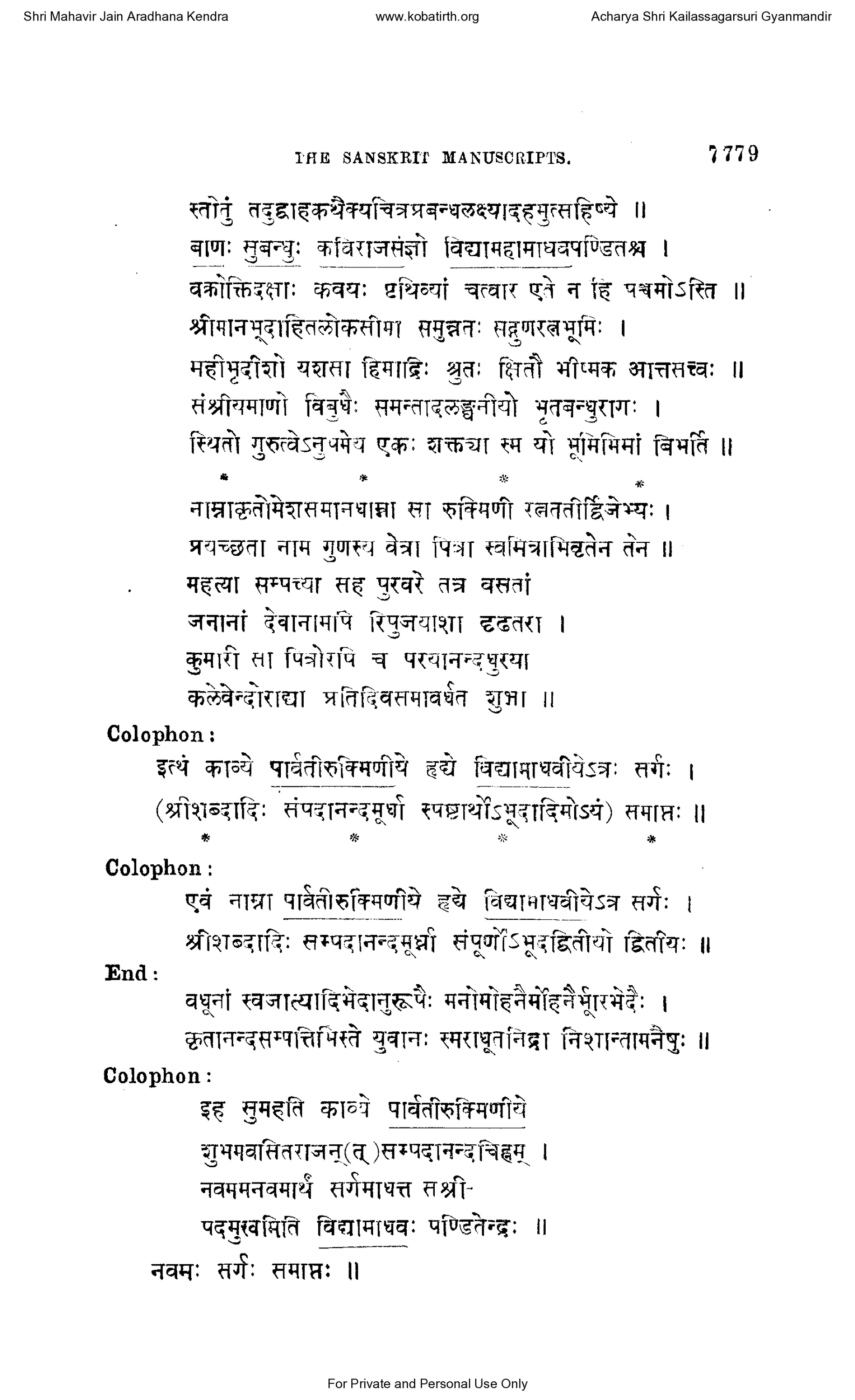 Shri Mahavir Jain Aradhana Kendra www.kobatirth.org Acharya Shri Kailassagarsuri Gyanmandir THE SANSKRIT MANUSCRIPTS. 7779 स्तोतुं तदुद्वाहकथैक्यचित्रप्रबन्धलक्ष्यादहमुत्सहिष्ये ॥