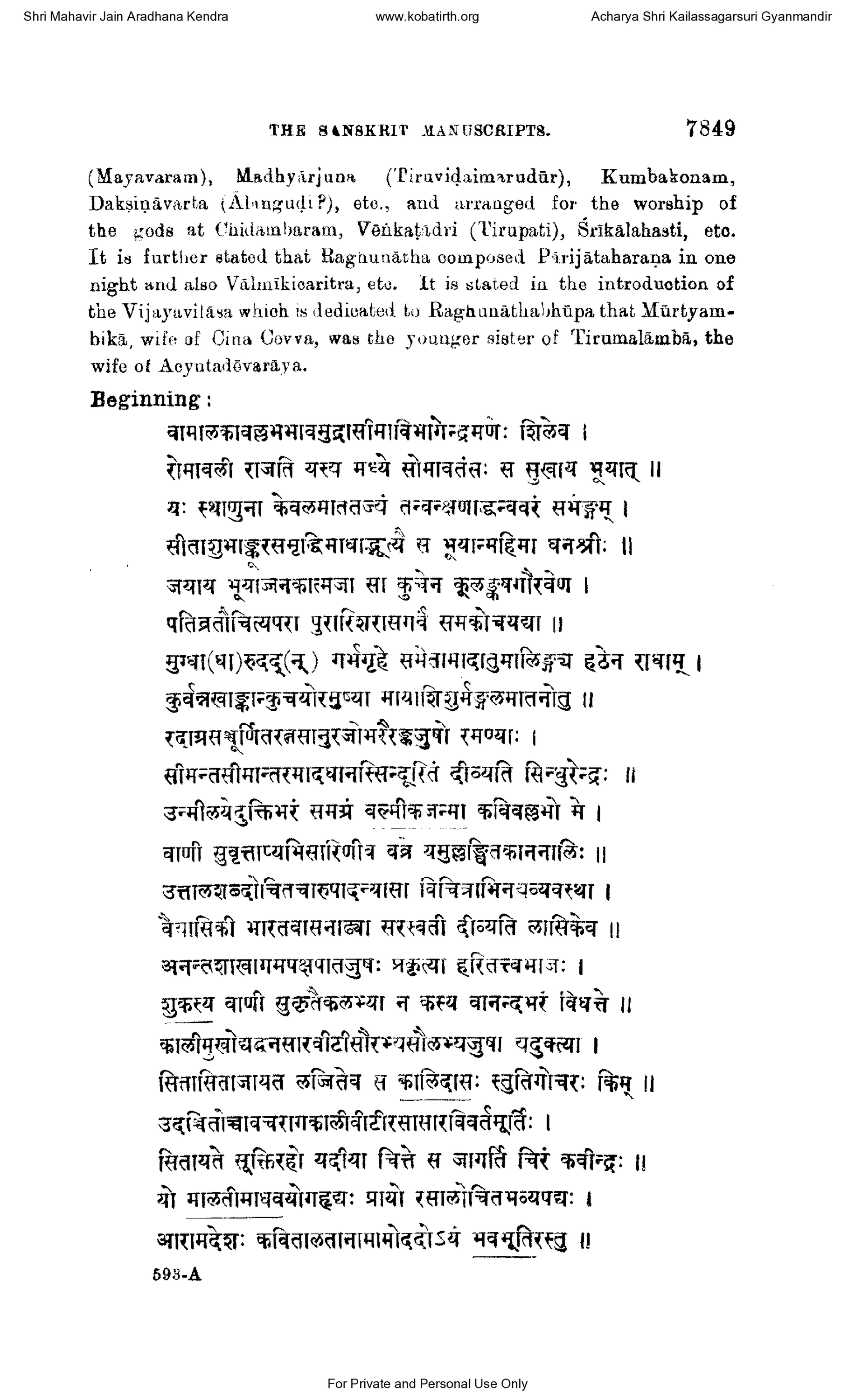 Shri Mahavir Jain Aradhana Kendra www.kobatirth.org Acharya Shri Kailassagarsuri Gyanmandir THE SANSKRIT MANUSCRIPTS. 7849 (Mayavaram), Madhyārjana (Piravidaimarudūr), Kumbakonam,