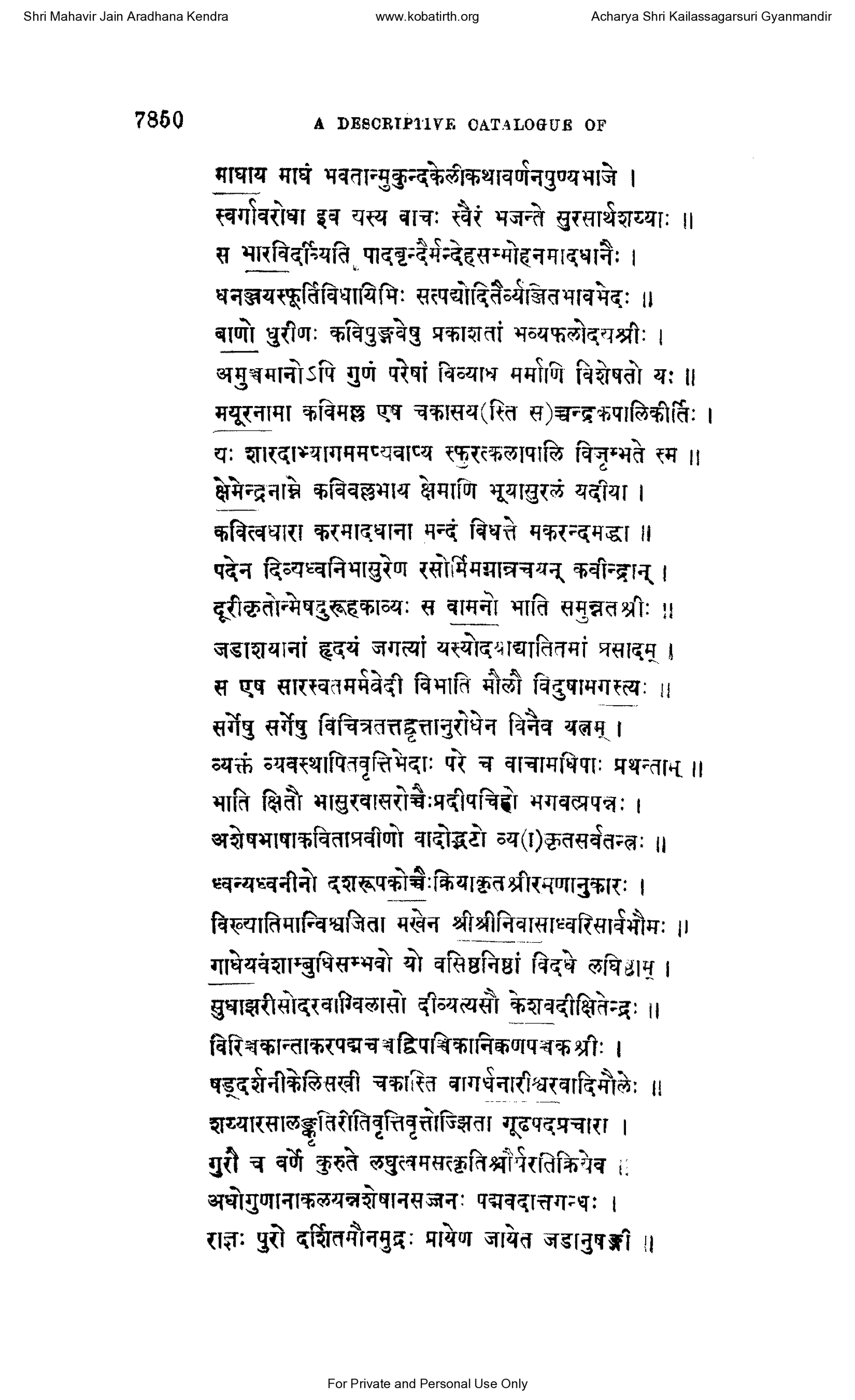 Shri Mahavir Jain Aradhana Kendra www.kobatirth.org Acharya Shri Kailassagarsuri Gyanmandir 7850 A DESCRIPTIVE CATALOGUE OF