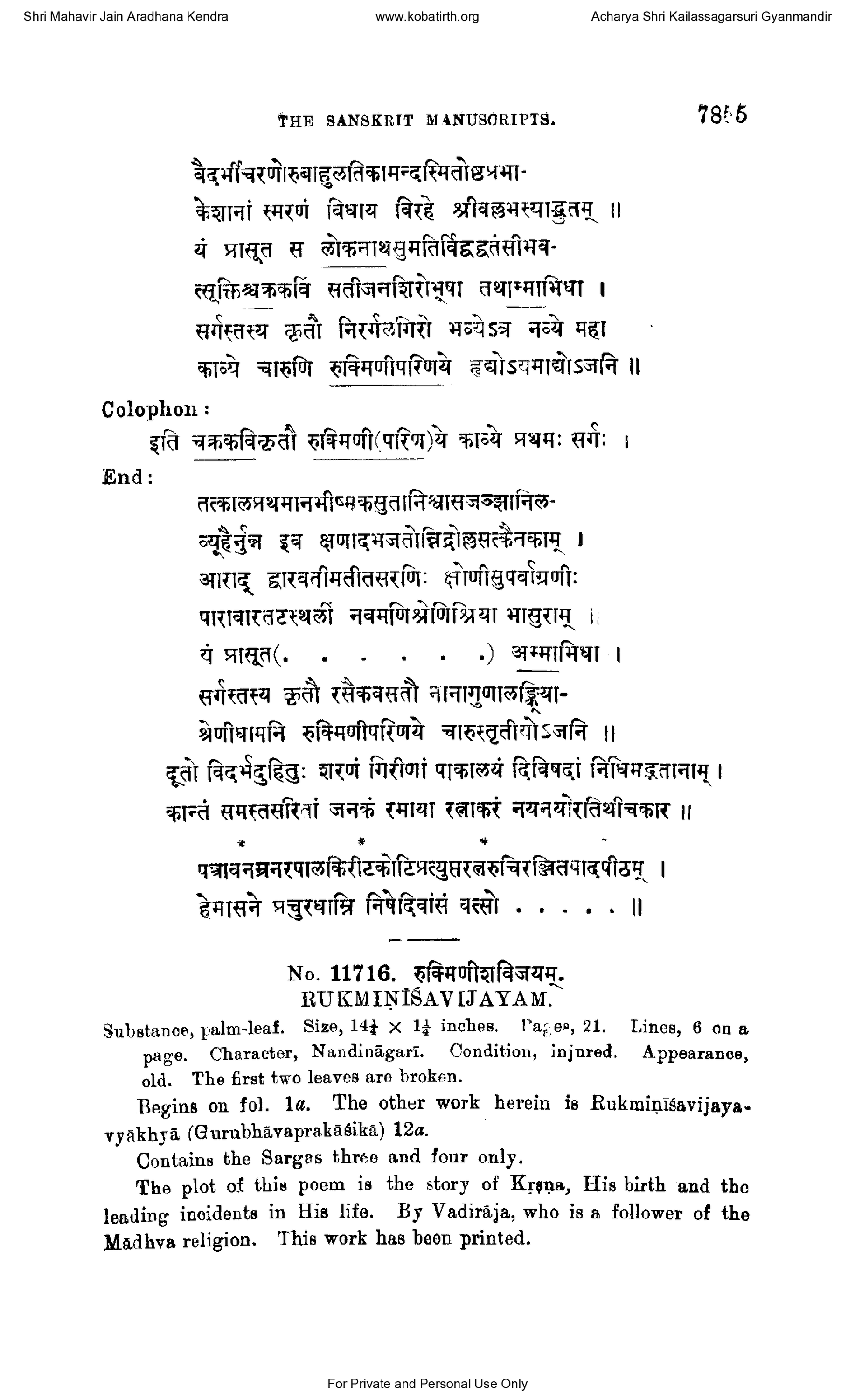 Shri Mahavir Jain Aradhana Kendra www.kobatirth.org Acharya Shri Kailassagarsuri Gyanmandir THE SANSKRIT MANUSCRIPTS. वैदर्भीचरणेोरुबाहुलतिकामन्दस्मितोष्ठप्रमा- केशानां स्मरणं विधाय विरहे श्रीवल्लभस्याद्भुतम् ॥ यं प्रासूत स लोकनाथसुमतिर्विद्वद्वतंसीभव- त्सूक्तिश्चक्रकविं सतीजन शिरोभूषा तथाम्माभिधा । सर्गस्तस्य कृतौ निरर्गलगिरो भव्येऽत्र नव्ये महा काव्ये चारुणि रुक्मिणीपरिणये हृद्योऽयमाद्योऽजनि ॥ [vaidarbhīcaraṇeोrubāhulatikāmandasmitoṣṭhapramā- keśānāṃ smaraṇaṃ vidhāya virahe śrīvallabhasyādbhutam || yaṃ prāsūta sa lokanāthasumatirvidvadvataṃsībhava- tsūktiścakrakaviṃ satījana śirobhūṣā tathāmmābhidhā | sargastasya kṛtau nirargalagiro bhavye'tra navye mahā kāvye cāruṇi rukmiṇīpariṇaye hṛdyo'yamādyo'jani || ] Colophon : End : इति चक्रकविकृतौ रुक्मिणी ( परिण) ये काव्ये प्रथमः सर्गः । तत्कालप्रथमानभीष्म कसुतानिश्वासजन्झानिल- व्यूहैर्नुन्न इव क्षणादभजतोन्निद्रोल्लसत्कैनकाम् । आराद् द्वारवतीमतीतसरणिः क्षोणीसुपर्वाग्रणीः पारावारतटस्थली नवमणिश्रेणिश्रिया भासुराम् | यं प्रासूत ( [iti cakrakavikṛtau rukmiṇī ( pariṇa) ye kāvye prathamaḥ sargaḥ | tatkālaprathamānabhīṣma kasutāniśvāsajanjhānila- vyūhairnunna iva kṣaṇādabhajatonnidrollasatkainakām | ārād dvāravatīmatītasaraṇiḥ kṣoṇīsuparvāgraṇīḥ pārāvārataṭasthalī navamaṇiśreṇiśriyā bhāsurām | yaṃ prāsūta (] • " ●) अम्माभिधा । सर्गस्तस्य कृतौ रसैकवसतौ नानागुणालङ्कया- [ammābhidhā | sargastasya kṛtau rasaikavasatau nānāguṇālaṅkayā- ] 7855 श्रेणीधामनि रुक्मिणीपरिणये चारुस्तृतीयोऽजनि ॥