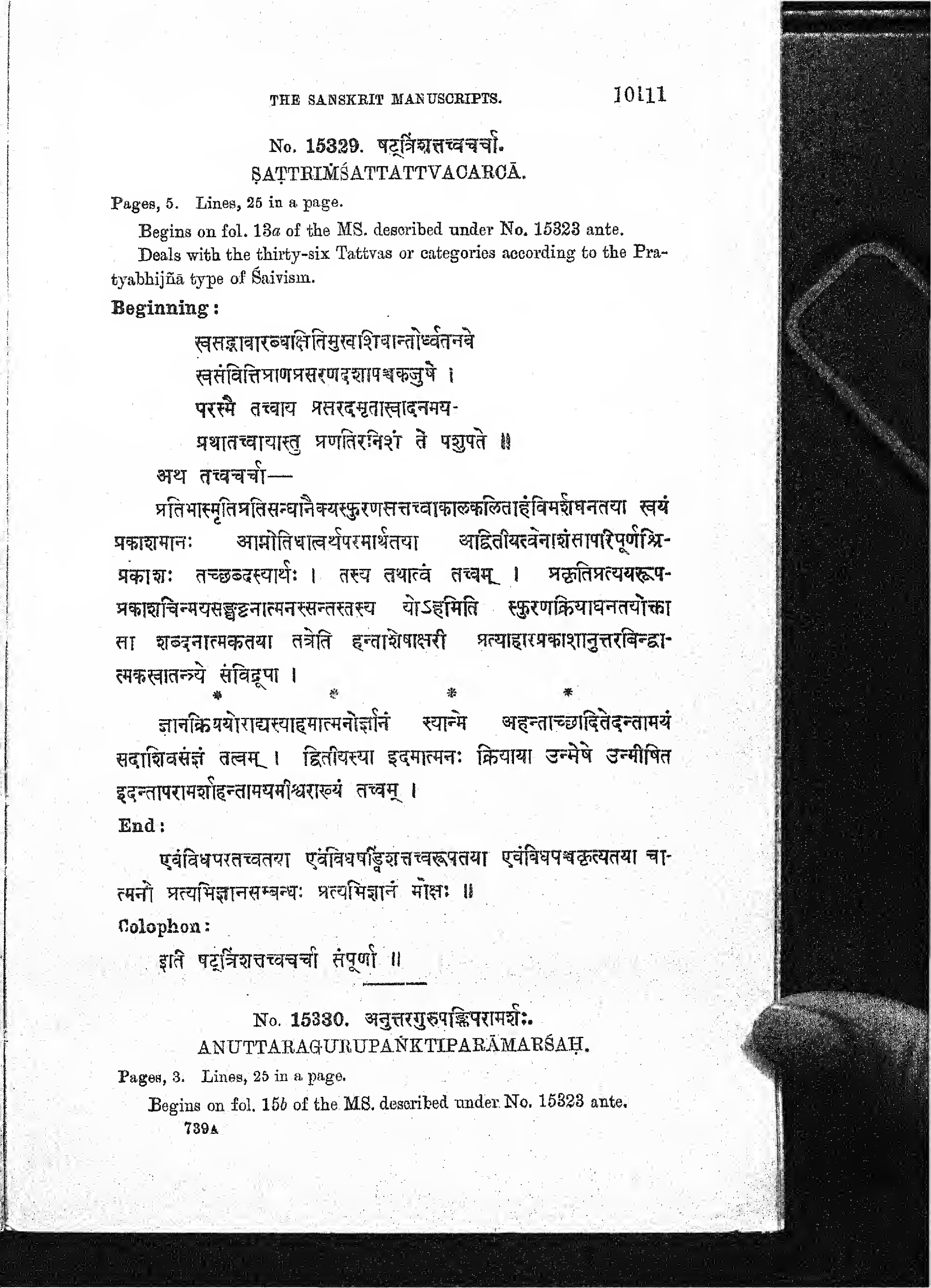 THE SANSKRIT MAN USCRIPTS. No. 15329. षटूत्रिंशत्तच्च चर्चा. [ṣaṭūtriṃśattacca carcā. ] ṢATTRIṂŚATTATTVACARCĀ. Pages, 5. Lines, 25 in a page. 10111 Begins on fol. 13a of the MS. described under No. 15323 ante.