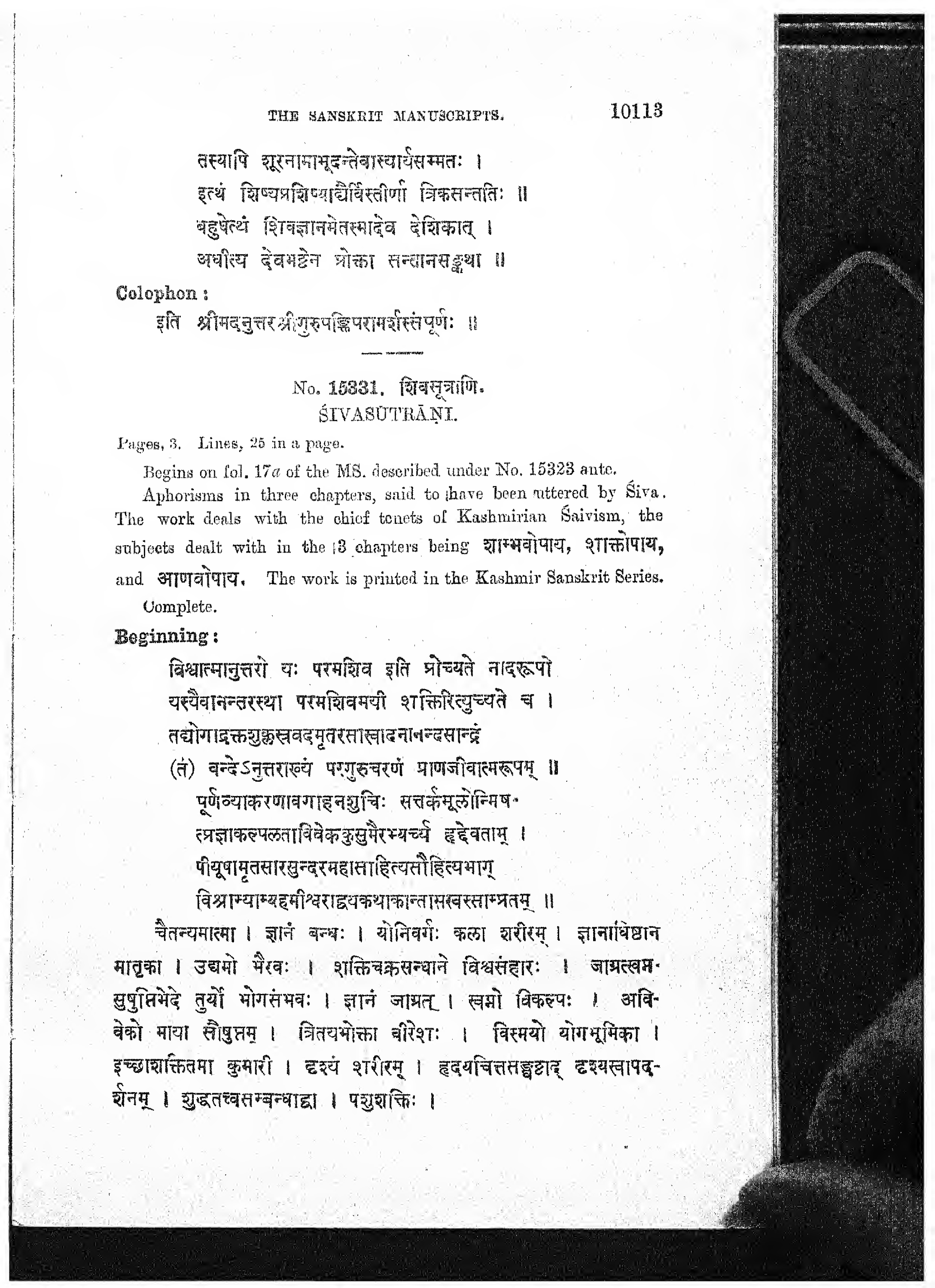 THE SANSKRIT MANUSCRIPTS. तस्यापि शूरनामाभूदन्तेवास्यार्थसम्मतः । इत्थं शिष्यप्रशिष्याद्यैर्विस्तीर्णा त्रिकसन्ततिः ॥ बहुपेत्थं शिवज्ञानमेतस्मादेव देशिकात् । अधीत्य देवभटेन प्रोक्ता सन्तानसङ्कथा || [tasyāpi śūranāmābhūdantevāsyārthasammataḥ | itthaṃ śiṣyapraśiṣyādyairvistīrṇā trikasantatiḥ || bahupetthaṃ śivajñānametasmādeva deśikāt | adhītya devabhaṭena proktā santānasaṅkathā || ] Colophon : इति श्रीमदनुत्तर श्रीगुरुपङ्क्तिपरामर्शस्तं पूर्णः ॥ [iti śrīmadanuttara śrīgurupaṅktiparāmarśastaṃ pūrṇaḥ || ] No. 15331. शिवसूत्राणि - [śivasūtrāṇi - ] ŚIVASUTRĀNI. Pages, 3. Lines, 25 in a page. 10113 Siva.