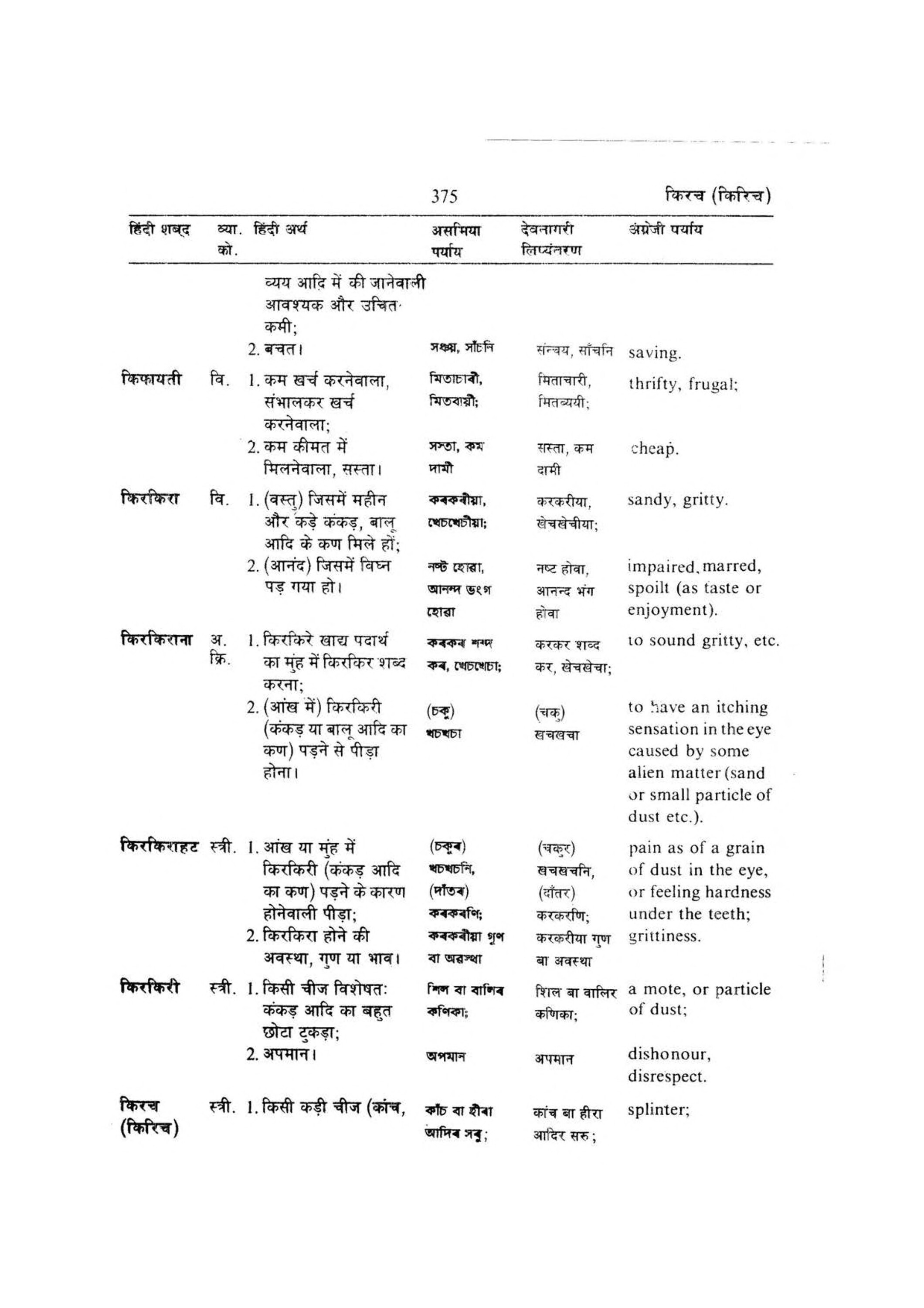 हिंदी शब्द व्या. हिंदी अर्थ को. व्यय आदि में की जानेवाली आवश्यक और उचित कमी [hiṃdī śabda vyā. hiṃdī artha ko. vyaya ādi meṃ kī jānevālī āvaśyaka aura ucita kamī] ; 4 375 किरच (किरिच)