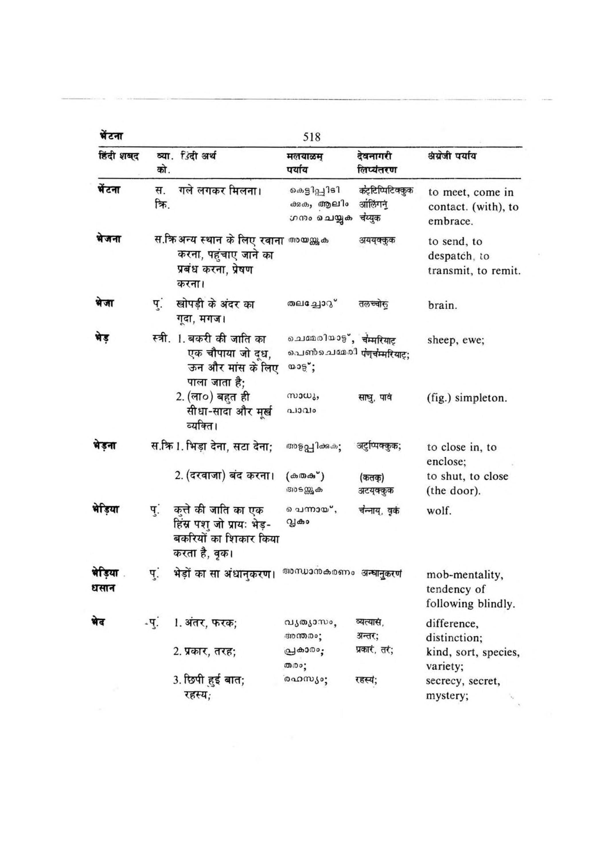 भेंटना हिंदी शब्द व्या. हिंदी अर्थ को. [bheṃṭanā hiṃdī śabda vyā. hiṃdī artha ko. ] 518 मलयाळम्
