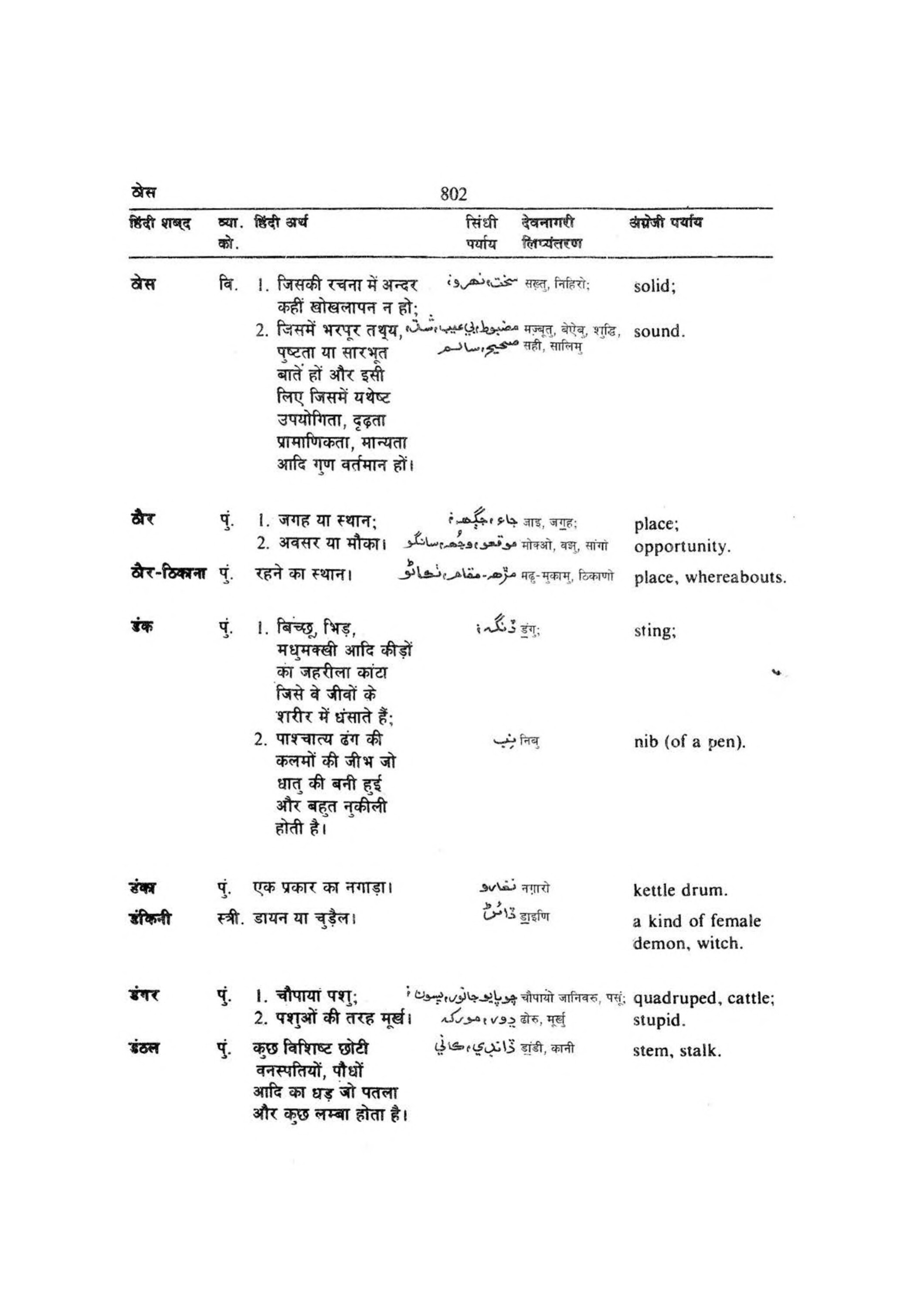 ठोस हिंदी शब्द व्या. हिंदी अर्थ को. वेस वि. [ṭhosa hiṃdī śabda vyā. hiṃdī artha ko. vesa vi. ] 1. जिसकी रचना में अन्दर कहीं खोखलापन न हो [jisakī racanā meṃ andara kahīṃ khokhalāpana na ho] ; 802 सिंधी देवनागरी