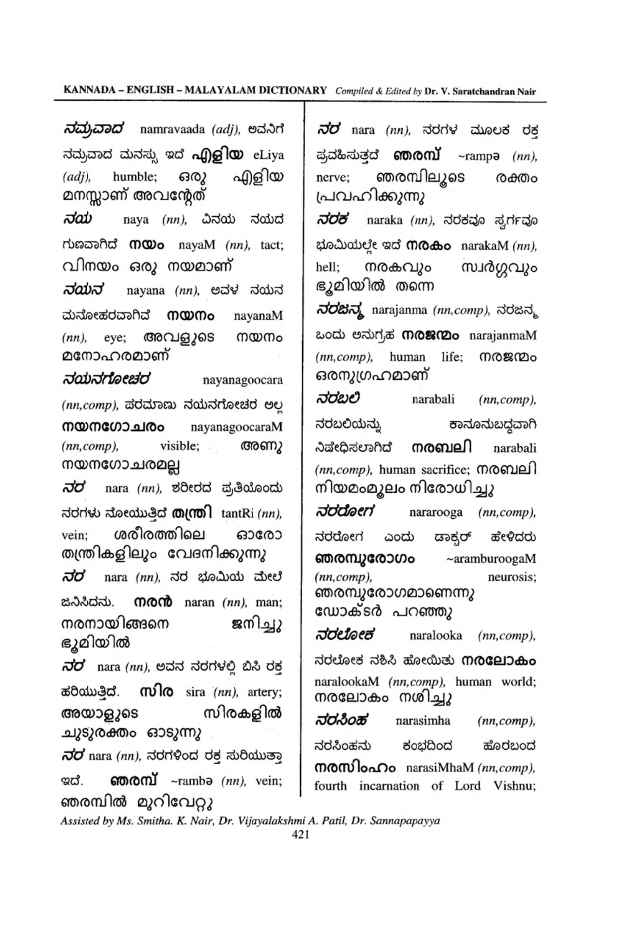 KANNADA ENGLISH - MALAYALAM DICTIONARY Compiled & Edited by Dr. V. Saratchandran Nair sad namravaada (adj), റ് ആ കാ ജ് എളിയ eLiya (adj), humble; ഒരു എളിയ മനസ്സാണ് അവന്റേത് ನಯ naya (an), യ Mo nayaM (nn), tact; വിനയം ഒരു നയമാണ് 60 നയനം ನಯನ (nn), eye; അവളുടെ മനോഹരമാണ് ನಯನಗೋಚರ nayanaM നയനം nerve; ഞരമ്പിലൂടെ പ്രവഹിക്കുന്നു ನರಕ -rampǝ (nn), naraka (nn), 380 രക്തം യാ ജ നരകം narakaM (nn), hell; നരകവും ഭൂമിയിൽ തന്നെ സ്വർഗ്ഗവും JOB narajanma (nn,comp), 38, ചായ കയർ നരജന്മം narajanmaM (nn,comp), human life; നരജന്മം ഒരനുഗ്രഹമാണ് nayanagoocara (nn,comp), യ ശ ನರಬಲಿ ನರಬಲಿಯನ್ನು അണു നയനഗോചരം nayanagoocaraM (nn,comp), visible; നയനഗോചരമല്ല ನರ nara (nn), Beddo Jam tantRi (nn), vein; ശരീരത്തിലെ ഓരോ തന്ത്രികളിലും വേദനിക്കുന്നു ನರ nara (an), 33 വയ ಜನಿಸಿದನು. mond naran (nn), man; നരനായിങ്ങനെ ഭൂമിയിൽ ജനിച്ചു I nara (nn), 33 39 258 8 ಹರಿಯುತ್ತಿದೆ. mo sira (nn), artery; അയാളുടെ ചുടുരക്തം ഓടുന്നു സിരകളിൽ SS nara (nn), Zod 38 കിയ m-rambǝ (nn), vein; ഞരമ്പിൽ മുറിവേറ്റു narabali (nn,comp), ಕಾನೂನುಬದ್ಧವಾಗಿ ನಿಷೇಧಿಸಲಾಗಿದೆ നരബലി narabali (nn,comp), human sacrifice; momen നിയമംമൂലം നിരോധിച്ചു ನರರೋಗ nararooga (nn,comp), ನರರೋಗ ಎಂದು ಡಾಕ್ಟರ್ ಹೇಳಿದರು ഞരമ്പുരോഗം (nn,comp), ~aramburoogaM neurosis; ഞരമ്പുരോഗമാണെന്നു ഡോക്ടർ പറഞ്ഞു ನರಲೋಕ naralooka (nn,comp), naralookaM (nn,comp), human world; നരലോകം നശിച്ചു ನರಸಿಂಹ narasimha (nn,comp), ನರಸಿಂಹನು ಕಂಭದಿಂದ ಹೊರಬಂದ momono narasiMhaM (nn, comp), fourth incarnation of Lord Vishnu; Assisted by Ms. Smitha. K. Nair, Dr. Vijayalakshmi A. Patil, Dr. Sannapapayya 421