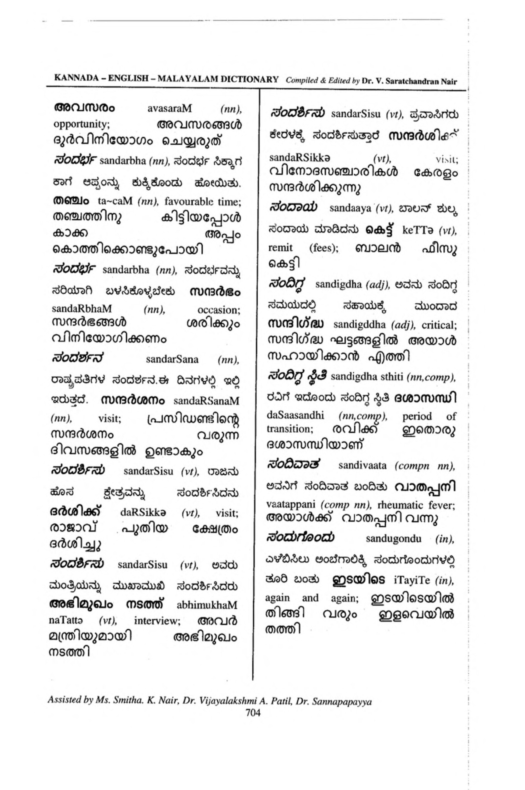 KANNADA ENGLISH - MALAYALAM DICTIONARY Compiled & Edited by Dr. V. Saratchandran Nair അവസരം opportunity; avasaraM (nn), അവസരങ്ങൾ ദുർവിനിയോഗം ചെയ്യരുത് doda sandarbha (nn), Soda ಕಾಗೆ ಆಪ್ಪಂನ್ನು ಕುಕ್ಕಿಕೊಂಡು ಹೋಯಿತು. 6lo ta-caM (nn), favourable time; തഞ്ചത്തിനു കാക്ക കിട്ടിയപ്പോൾ അപ്പം കൊത്തിക്കൊണ്ടുപോയി Jodi sandarbha (nn), Soda യ മഴ സന്ദർഭം sandaRbhaM സന്ദർഭങ്ങൾ വിനിയോഗിക്കണം ಸಂದರ್ಶನ occasion; ശരിക്കും sandarSana ರಾಷ್ಟ್ರಪತಿಗಳ ಸಂದರ್ಶನ.ಈ ದಿನಗಳಲ್ಲಿ ಇಲ್ಲಿ ജയം. സന്ദർശനം sandaRSanaM visit; പ്രസിഡണ്ടിന്റെ സന്ദർശനം ദിവസങ്ങളിൽ ഉണ്ടാകും ಸಂದರ್ಶಿಸು sandarSisu (vt), വരുന്ന ಹೊಸ ಕ್ಷೇತ್ರವನ್ನು ಸಂದರ್ಶಿಸಿದನು ദർശിക്ക് daRSikkǝ (vt), visit; രാജാവ് പുതിയ ക്ഷേത്രം ദർശിച്ചു ಸಂದರ್ಶಿಸು sandarSisu (vt), wo ಮಂತ್ರಿಯನ್ನು ಮುಖಾಮುಖಿ ಸಂದರ್ಶಿಸಿದರು അഭിമുഖം നടത്ത് abhimukhaM (vt), interview; JodF sandarSisu (vt), ed sodari sandaRSikkə സന്ദർശിക്ക് (vt), visit; വിനോദസഞ്ചാരികൾ കേരളം സന്ദർശിക്കുന്നു ood sandaaya (vt), അല് remit (fees); ബാലൻ ഫീസു കെട്ടി Job sandigdha (adj), 3d ob ಸಮಯದಲ್ಲಿ ಸಹಾಯಕ್ಕೆ ಮುಂದಾದ mumu sandigddha (adj), critical; സന്ദിഗ്ദ്ധ ഘട്ടങ്ങളിൽ അയാൾ സഹായിക്കാൻ എത്തി Josandigdha sthiti (nn,comp), മാറ് ജായ രം 8 ദശാസന്ധി daSaasandhi (nn.comp), period transition; രവിക്ക് ദശാസന്ധിയാണ് ನಂದಿವಾತ of ഇതൊരു sandivaata (compn nn), മാറ് അത് യം വാതപ്പനി vaatappani (comp nn), rheumatic fever; അയാൾക്ക് വാതപ്പനി വന്നു ಸಂದುಗೊಂದು sandugondu (in), ಎಳೆಬಿಸಿಲು ಅಂಬೆಗಾಲಿಕ್ಕಿ ಸಂದುಗೊಂದುಗಳಲ್ಲಿ 8 മം ഇടയിടെ iTayiTe (in), again and again; ഇടയിടെയിൽ തിങ്ങി അവർ തത്തി മന്ത്രിയുമായി അഭിമുഖം naTattǝ നടത്തി വരും ഇളവെയിൽ Assisted by Ms. Smitha. K. Nair, Dr. Vijayalakshmi A. Patil, Dr. Sannapapayya 704