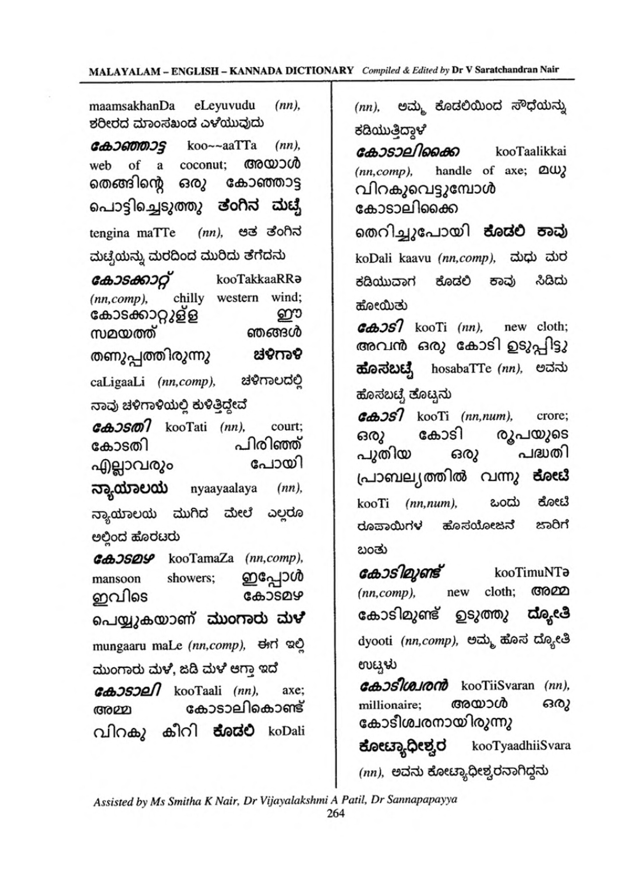 MALAYALAM - ENGLISH-KANNADA DICTIONARY Compiled & Edited by Dr Saratchandran Nair (nn), maamsakhanDa eLeyuvudu ಶರೀರದ ಮಾಂಸಖಂಡ ಎಳೆಯುವುದು കോഞ്ഞാട്ട kooaaTTa (nn), web of a coconut; അയാൾ തെങ്ങിന്റെ ഒരു കോഞ്ഞാട്ട പൊട്ടിച്ചെടുത്തു on tengina maTTe (nn), & & ಮಟ್ಟೆಯನ್ನು ಮರದಿಂದ ಮುರಿದು ತೆಗೆದನು കോടക്കാറ്റ് kooTakkaaRRǝ (nn,comp), chilly western wind; കോടക്കാറ്റുള ಕಡಿಯುತ್ತಿದ್ದಾಳೆ കോടാലിക്കെ kooTaalikkai (nn,comp), handle of axe; w വിറകുവെട്ടുമ്പോൾ കോടാലിക്കൈ തെറിച്ചുപോയി koDali kaavu (nn.comp), ಕಡಿಯುವಾಗ ಕೊಡಲಿ ಕಾವು ಹೋಯಿತು 20 ಸಿಡಿದು