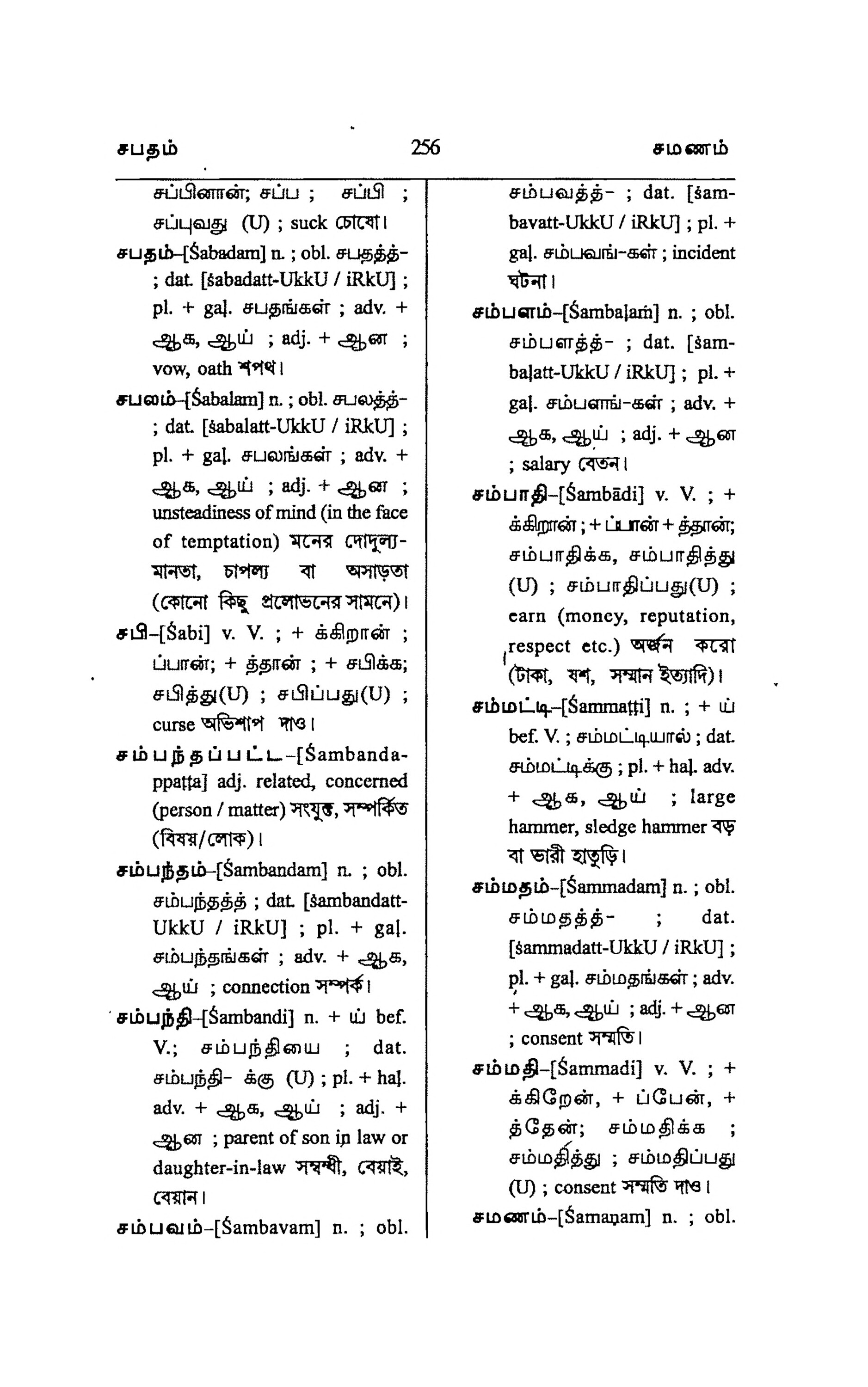 சபதம் சப்பினான்; சப்ப ; சப்பி ; சப்புவது (U) ; suck (btct: சபதம் [Śabadam]n. ; obl. சபதத்த்- ; dat. [sabadatt-UkkU / iRkU] ; p1+ga.சபதங்கள் ; adv. + ஆக, ஆய் ;adj. + ஆன ; vow, oath 791 சபலம் [Sabalam]n. ; obl. சபலத்த்- ; dat. [śabalatt-UkkU / iRkU] ; p1+gal. சபலங்கள் ;adv. + ஆக,ஆய் ;adj.+ஆன ; unsteadiness of mind (in the face of temptation) - CAMU মানতা, চাপল্য বা অসাড়তা (কোনো কিছু প্রলোভনের সামনে)। [| ] சபி -[Śabi] v. V. ; + க்கிறான் ; ப்பான்; + த்தான் ; + சபிக்க; சபித்து (U) ; சபிப்பது(U) ; curse ஞ்வு 731 சம்பந்தப்பட்ட-[Śambanda- ppatta] adj. related, concerned (person / matter) RE, 7f¥3 சம்பந்தம்-(Sambandam] n. ; obl. சம்பந்தத்த் ; dat. [sambandat- UkkU / iRkU] ; pl. + gal. சம்பந்தங்கள் ; adv. + ஆக, ஆய் ; connection 7q|¢ | சம்பந்தி-[Śambandi) n. + ய் bef. V.; சம்பந்தியை ; dat. Ħúuð- ¿¿ (U); pl. + hal. adv. + ஆக, ஆய் ;adj.+ ஆன ; parent of son in law or daughter-in-law , ம், எ சம்பவம்- [Sambavam] n.;obl. 256 சமணம்