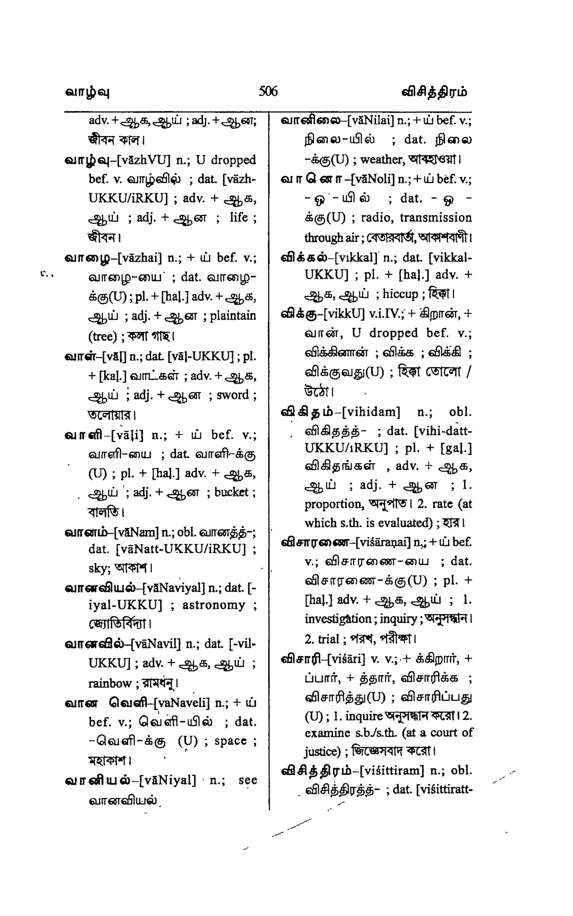 வாழ்வு adv.+ஆக,ஆய் ; adj.+ஆன; জীবন কাল। [| ] ama–[vāzhVU] n.; U dropped bef. v. வாழ்வில் ; dat. (vāzh- UKKU/iRKU] ;adv. + ஆக, ஆய் ; adj.+ ஆன ; life; வாழை-(vizhai) n.; + ய் bef. v.; வாழை-யை; dat. வாழை- க்கு(U); pl.+(ha].] adv. +ஆக, ஆய்; adj.+ஆன ; plaintain (tree); w· 5 வாள்-(vāl) n; dat (vā] - UKKU]; pl. + [kal.] வாட்கள் ;adv.+ஆக, ஆய்; adj.+ஆன ; sword; তলোয়ার। [| ] curafi_[vāḷi] n.; + ш bef. v.; - வாளி-யை ; dat வாளி-க்கு (U); pl. + [hal.] adv. + 2, ஆய்; adj.+ ஆன ; bucket; வானம்-[vāNam]n.; obl. வானத்த்-; dat. [väNatt-UKKU/iRKU]; sky; èftf/ வானவியல் -(vāNaviyal] n ; dat- iyal-UKKU) ; astronomy ; জ্যোতির্বিদ্যা। [| ] வானவில் (vaNavil) n.; dat (-vil- UKKU] ; adv. + ஆக, ஆய் ; rainbow ; எ வான வெளி(vaNaveli) n.; + ய் bef.v.; வெளி-யில் ; dat. வெளி-க்கு (U) ; space ; வானியல் - (vāNiyal)n; see வானவியல் 506 விசித்திரம்
