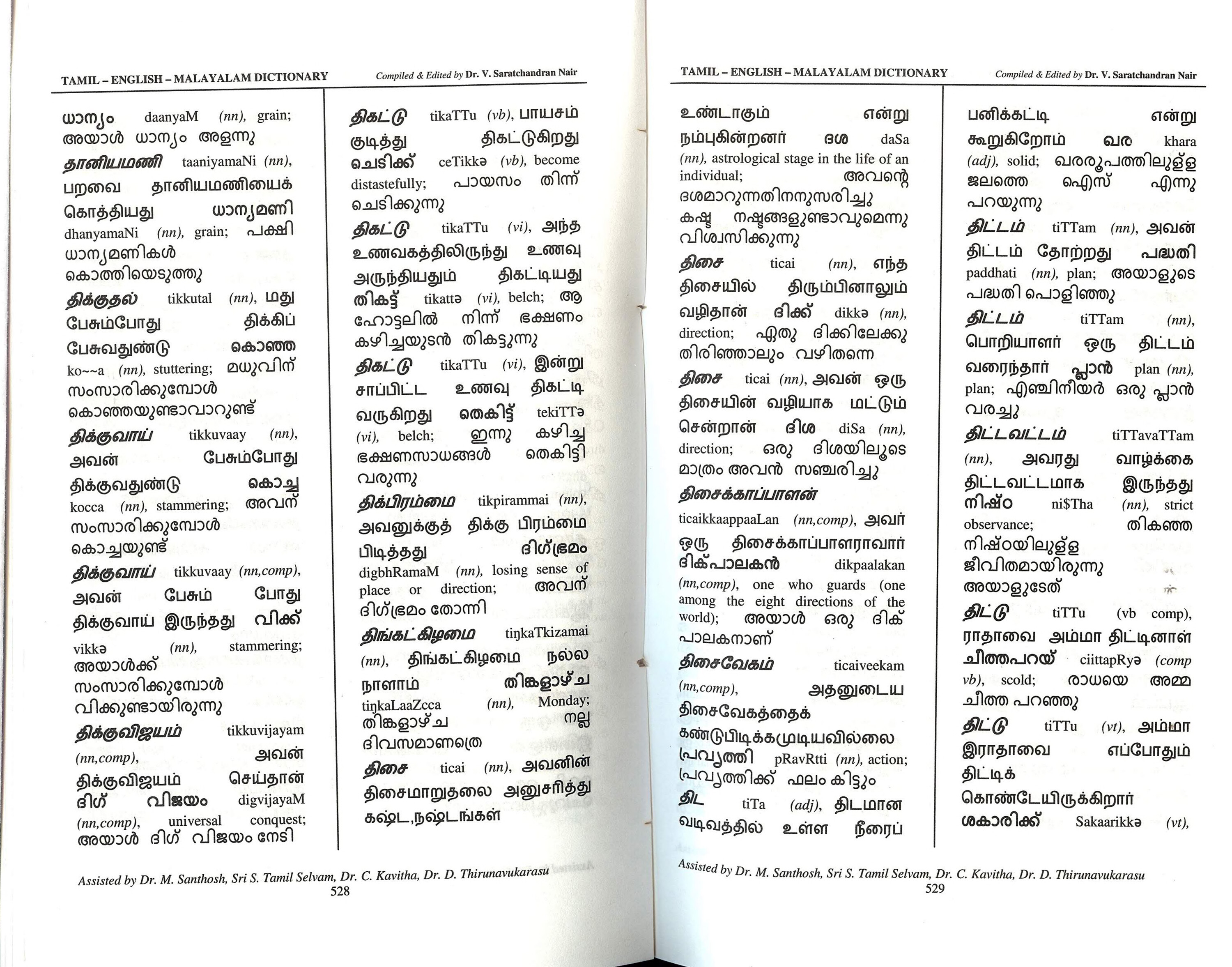 ചെടിക്ക് ceTikka (vb), become distastefully; உண்டாகும் நம்புகின்றனர் (nn), astrological stage in the life of an individual; khara (adj), solid; வ00வணிபத்தி - TAMIL ENGLISH - MALAYALAM DICTIONARY Compiled & Edited by Dr. V. Saratchandran Nair TAMIL - ENGLISH-MALAYALAM DICTIONARY ധാന്യം daanyaM (nn), grain; திகட்டு അയാൾ ധാന്യം അളന്നു தானியமணி taaniyamaNi (nn), குடித்து tikaTTu (vb), பாயசம் திகட்டுகிறது என்று ദശ daSa பனிக்கட்டி Compiled & Edited by Dr. V. Saratchandran Nair என்று கூறுகிறோம் பறவை தானியமணியைக் പായസം തിന്ന് ജലത്തെ ഐസ് கொத்தியது dhanyamaNi (nn), grain; வளி திட்டம் ധാന്യമണികൾ കൊത്തിയെടുത്തു ചെടിക്കുന്നു ധാന്യമണി திக்குதல் tikkutal (nn), மது பேசும்போது பேசுவதுண்டு സംസാരിക്കുമ്പോൾ திக்கிப் കൊഞ്ഞ ko~~a (nn), stuttering; wவிறீ കൊഞ്ഞയുണ്ടാവാറുണ്ട് திக்குவாய் tikkuvaay (nn), பேசும்போது കൊച്ച kocca (nn), stammering; Goவர் அவன் திக்குவதுண்டு സംസാരിക്കുമ്പോൾ കൊച്ചയുണ്ട് திக்குவாய் tikkuvaay (n,comp), அவன் பேசும் போது திக்குவாய் இருந்தது விகல் vikkǝ അയാൾക്ക് (nn), stammering; സംസാരിക്കുമ്പോൾ വിക്കുണ്ടായിരുന്നു திக்குவிஜயம் (nn,comp), திக்குவிஜயம் ദിഗ് വിജയം tikkuvijayam அவன் செய்தான் digvijayaM (nn,comp), universal conquest; അയാൾ ദിഗ് വിജയം നേടി tikaTTu திகட்டு (vi), அந்த உணவகத்திலிருந்து உணவு அருந்தியதும் திகட்டியது തികട്ട് tikattǝ (vi), belch; (C ഹോട്ടലിൽ നിന്ന് ഭക്ഷണം കഴിച്ചയുടൻ തികട്ടുന്നു திகட்டு tikaTTu (vi), இன்று சாப்பிட்ட வருகிறது உணவு திகட்டி கைŚ tekiTTa തെകിട്ട് (vi), belch; ഇന്നു കഴിച്ച തെകിട്ടി ഭക്ഷണസാധങ്ങൾ വരുന്നു திக்பிரம்மை tikpirammai (nn), அவனுக்குத் திக்கு பிரம்மை பிடித்தது ദിഗ്ഭ്രമം അവന് digbhRamaM (nn), losing sense of direction; place or ദിഗ്ഭ്രമം തോന്നി திங்கட்கிழமை tiŋkaTkizamai (nn), திங்கட்கிழமை நல்ல நாளாம் tinkaLaaZcca തിങ്കളാഴ്ച ദിവസമാണ് (nn), തിങ്കളാഴ്ച Monday; നല്ല திசை ticai (nn), அவனின் திசைமாறுதலை அனுசரித்து கஷ்ட,நஷ்டங்கள் Assisted by Dr. M. Santhosh, Sri S. Tamil Selvam, Dr. C. Kavitha, Dr. D. Thirunavukarasu 528 അവന്റെ
