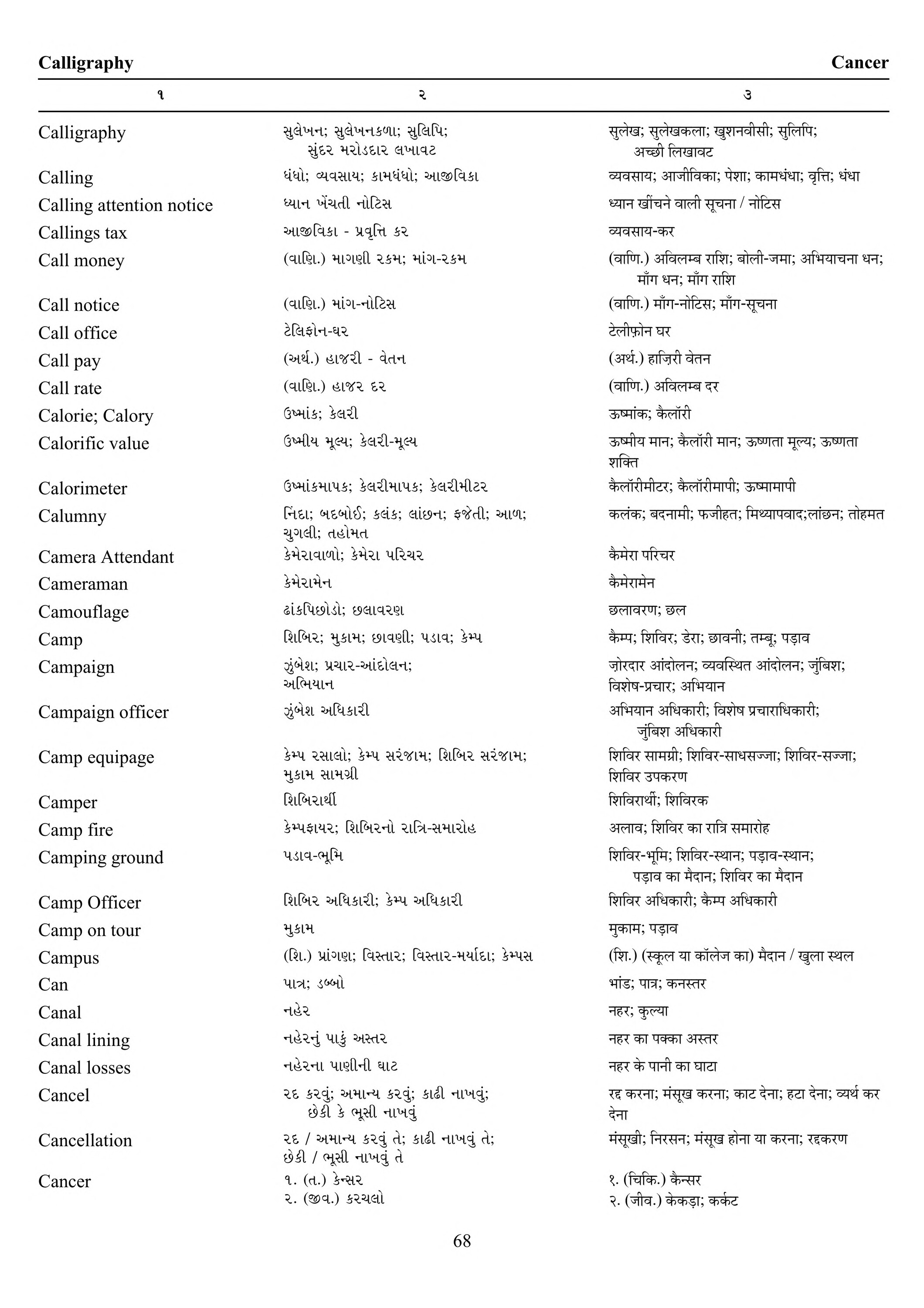 Calligraphy Cancer Calligraphy Calling ૧ Calling attention notice Callings tax Call money Call notice Call office Call pay Call rate Calorie; Calory Calorific value Calorimeter Calumny Camera Attendant Cameraman Camouflage Camp Campaign Campaign officer Camp equipage Camper Camp fire Camping ground Camp Officer Camp on tour Campus Can Canal Canal lining Canal losses Cancel Cancellation Cancer ૨ सुसेजन [susejana] ; सुझेजनणा [sujhejanaṇā] ; सुलिपि [sulipi] ; સુંદર મરોડદાર લખાવટ धंधो व्यवसायः अमधंधोः खाभविडा [dhaṃdho vyavasāyaḥ amadhaṃdhoḥ khābhaviḍā ] ધ્યાન ખેંચતી નોટિસ આજીવિકા - પ્રવૃત્તિ કર ( वाशि.) भागशी र भ [vāśi.) bhāgaśī ra bha] ; मांग- २ भ (वाशि.) मांग- नोटिस [māṃga- 2 bha (vāśi.) māṃga- noṭisa ] ટેલિફોન-ઘર (अर्थ.) हा४री - वेतन (वाशि.) हा४२ ६२ [artha.) hā4rī - vetana (vāśi.) hā42 62 ] ઉષ્માંક; કેલરી ઉષ્મીય મૂલ્ય; કેલરી-મૂલ્ય ઉષ્માંકમાપક; કેલરીમાપક; કેલરીમીટર निधाः पहजो [nidhāḥ pahajo ] ; ; सांछन [sāṃchana] ; इती [itī] ; खाण [khāṇa] ; ચુગલી; તહોમત કેમેરાવાળો: કેમેરા પરિચર કેમેરામેન ઢાંકપિછોડો; છલાવરણ शिजिर भुट्टाम [śijira bhuṭṭāma] ; छावशी [chāvaśī] ; पडाव [paḍāva] ; डेम्प मुंजेश [ḍempa muṃjeśa] ; प्रयार - होलन [prayāra - holana] ; અભિયાન ઝુંબેશ અધિકારી કેમ્પ રસાલો; કેમ્પ સરંજામ; શિબિર સરંજામ; મુકામ સામગ્રી શિબિરાર્થી કેમ્પફાયર; શિબિરનો રાત્રિ-સમારોહ પડાવ-ભૂમિ શિબિર અધિકારી; કેમ્પ અધિકારી મુકામ (शि.) प्रांगए [śi.) prāṃgae] ; विस्तार [vistāra] ; विस्तार-भर्याधी [vistāra-bharyādhī] ; डेम्पस [ḍempasa ] પાત્ર; ડબ્બો નહેર નહેરનું પાકું અસ્તર નહેરના પાણીની ઘાટ ૨દ કરવું; અમાન્ય કરવું; કાઢી નાખવું; છેકી કે ભૂસી નાખવું ૨૬ / અમાન્ય કરવું તે; કાઢી નાખવું તે; છેકી / ભૂસી નાખવું તે १. (त.) डेन्सर [1. (ta.) ḍensara ] ૨. (જીવ.) કરચલો 3 सुलेख, सुलेखकला [sulekha, sulekhakalā] ; खुशनवीसी, सुलिपि [khuśanavīsī, sulipi] ;