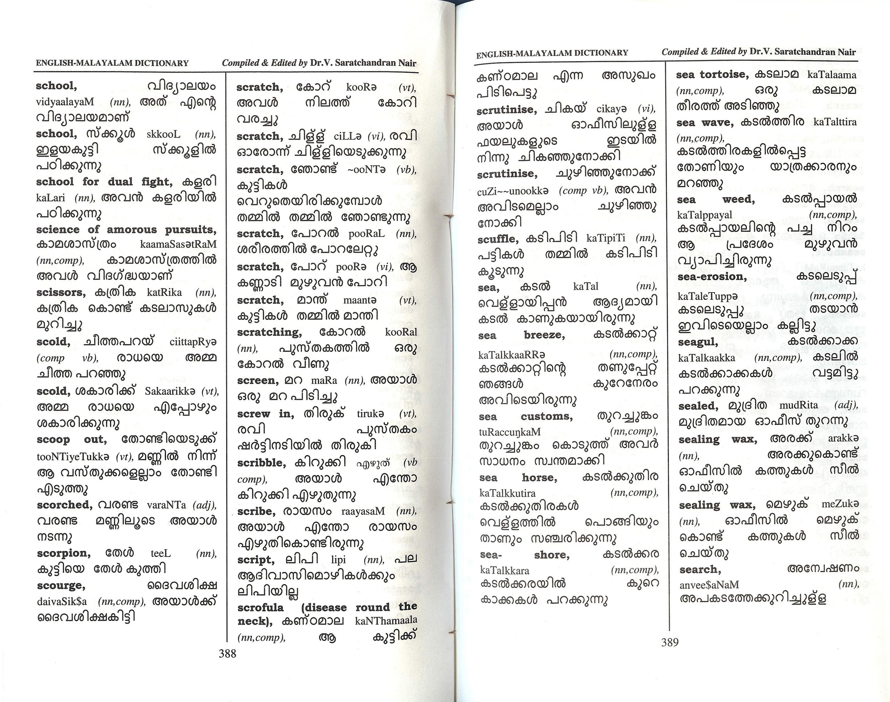ENGLISH-MALAYALAM DICTIONARY school, വിദ്യാലയം vidyalayaM (an), അത് എന്റെ വിദ്യാലയമാണ് school, skkool (nn), ഇളയകുട്ടി പഠിക്കുന്നു സ്ക്കൂളിൽ school for dual fight, 30 kaLari (an), അവൻ കളരിയിൽ പഠിക്കുന്നു science of amorous pursuits, കാമശാസ്ത്രം kaamaSasǝtRaM (nn,comp), കാമശാസ്ത്രത്തിൽ അവൾ വിദഗ്ദ്ധയാണ് scissors, (0) katRika (nn), കത്രിക കൊണ്ട് കടലാസുകൾ മുറിച്ചു scold, 2 (comp vb), രാധയെ ചീത്ത പറഞ്ഞു ciittapRyǝ അമ്മ scold, Sakaarikkǝ (vt), അമ്മ രാധയെ എപ്പോഴും ശകാരിക്കുന്നു scoop out, തോണ്ടിയെടുക്ക് tooNTiye Tukkǝ (vt), momm ആ വസ്തുക്കളെല്ലാം തോണ്ടി എടുത്തു scorched, Qos varaNTa (adj), വരണ്ട മണ്ണിലൂടെ അയാൾ നടന്നു scorpion, തേൾ teeL (nn), കുട്ടിയെ തേൾ കുത്തി scourge, daivaSik$a (nn,comp), w ദൈവശിക്ഷകിട്ടി Compiled & Edited by Dr.V. Saratchandran Nair scratch, അവൾ വരച്ചു kooǝ നിലത്ത് കോറി scratch, ciLLǝ (vi), o ഓരോന്ന് ചി്ളിയെടുക്കുന്നു scratch, 60-00ǝ (vb), കുട്ടികൾ വെറുതെയിരിക്കുമ്പോൾ തമ്മിൽ തമ്മിൽ തോണ്ടുന്നു scratch, 600 pooRaL (nn), ശരീരത്തിൽ പോറലേറ്റു scratch, 60 poorǝ (vi), (G കണ്ണാടി മുഴുവൻ പോറി scratch, maantǝ കുട്ടികൾ തമ്മിൽ മാന്തി scratching, കോറൽ (nn), പുസ്തകത്തിൽ കോറൽ വീണു screen, 20 maRa (nn), G ഒരു മറ പിടിച്ചു screw in, motirukǝ രവി kooRal ഒരു പുസ്തകം ഷർട്ടിനടിയിൽ തിരുകി scribble, കിറുക്കി എഴുത് (vb comp), അയാൾ എന്തോ കിറുക്കി എഴുതുന്നു scribe, wo raayasaM (nn), അയാൾ എന്തോ എഴുതികൊണ്ടിരുന്നു രായസം ENGLISH-MALAYALAM DICTIONARY കമാല എന്ന അസുഖം പിടിപെട്ടു scrutinise, cikayǝ (vi), അയാൾ ഓഫീസിലുള്ള ഇടയിൽ ഫയലുകളുടെ നിന്നു ചികഞ്ഞുനോക്കി scrutinise, ചുഴിഞ്ഞുനോക്ക് cuZi~~unookkǝ (comp vb), (co അവിടമെല്ലാം നോക്കി Compiled & Edited by Dr.V. Saratchandran Nair sea tortoise, s kaTalaama (nn,comp), ഒരു കടലാമ തീരത്ത് അടിഞ്ഞു sea wave, Soooo kaTalttira (nn,comp), കടൽത്തിരകളിൽപ്പെട്ട തോണിയും യാത്രക്കാരനും മറഞ്ഞു ചുഴിഞ്ഞു sea weed, കടൽപ്പായൽ kaTalppayal (nn,comp), scuffle, s kaTipiTi (nn), പട്ടികൾ തമ്മിൽ കടിപിടി കൂടുന്നു sea, കടൽ kaTal കടൽപ്പായലിന്റെ പച്ച നിറം പ്രദേശം മുഴുവൻ വ്യാപിച്ചിരുന്നു sea-erosion, (nn), kaTaleTuppǝ കടലെടുപ്പു $8 വെള്ളായിപ്പൻ ആദ്യമായി കടൽ കാണുകയായിരുന്നു breeze, കടൽക്കാറ്റ് sea kaTalkkaaRRǝ കടൽക്കാറ്റിന്റെ ഞങ്ങൾ അവിടെയിരുന്നു sea customs, tuRaccuŋkaM (nn,comp), തണുപ്പേറ്റ് കുറേനേരം തുറച്ചുങ്കം (nn,comp), തുറച്ചുങ്കം കൊടുത്ത് അവർ സാധനം സ്വന്തമാക്കി sea horse, കടൽക്കുതിര kaTalkkutira കടലെടുപ്പ് ഇവിടെയെല്ലാം കല്ലിട്ടു seagul, kaTalkaakka (nn,comp), തടയാൻ കടൽക്കാക്ക (nn,comp), കടലിൽ വട്ടമിട്ടു കടൽക്കാക്കകൾ പറക്കുന്നു sealed, 260 mudRita (adj), മുദ്രിതമായ ഓഫീസ് തുറന്നു sealing wax, (6) arakkǝ (nn), അരക്കുകൊണ്ട് ഓഫീസിൽ കത്തുകൾ സീൽ ചെയ്തു sealing wax, meZukǝ ഓഫീസിൽ കൊണ്ട് കത്തുകൾ (nn,comp), കടൽക്കുതിരകൾ വെള്ളത്തിൽ പൊങ്ങിയും താണും സഞ്ചരിക്കുന്നു (nn), പല sea- shore, കടൽക്കര ചെയ്തു kaTalkkara (nn,comp), search, കുറെ ലിപി script, lipi ആദിവാസിമൊഴികൾക്കും ലിപിയില്ല scrofula (disease round the ദൈവശിക്ഷ neck), (nn,comp), 388 o kaNThamaala
