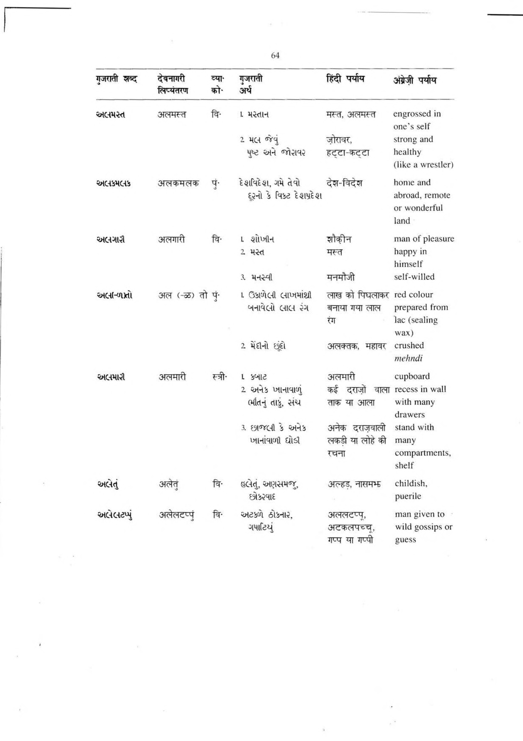 गुजराती शब्द देवनागरी व्या [gujarātī śabda devanāgarī vyā] · गुजराती लिप्यंतरण को. अर्थ [gujarātī lipyaṃtaraṇa ko. artha ] અલમસ્ત अलमस्त वि. [alamasta vi. ] 1 મસ્તાન 64 हिंदी पर्याय