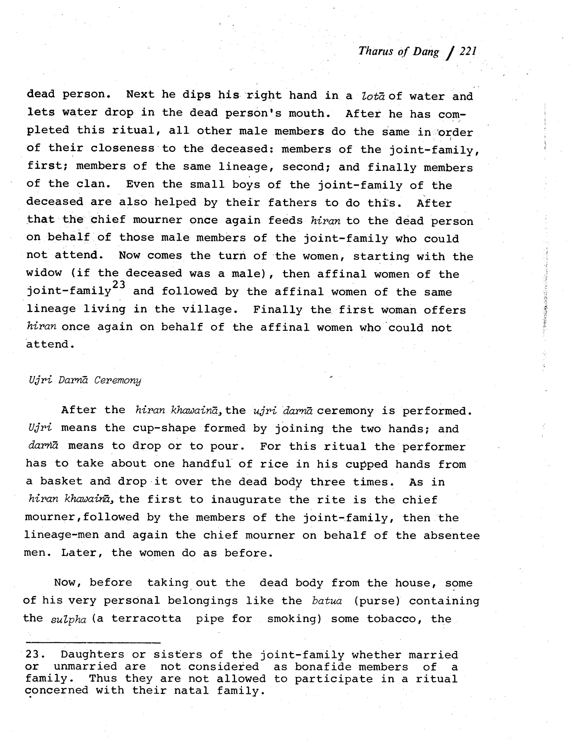 Tharus of Dang / 221 I dead person. Next he dips his right hand in a lota of water and lets water drop in the dead person's mouth. After he has com- pleted this ritual, all other male members do the same in order of their closeness to the deceased: members of the joint-family, first; members of the same lineage, second; and finally members of the clan. Even the small boys of the joint-family of the deceased are also helped by their fathers to do this. After that the chief mourner once again feeds hiran to the dead person on behalf of those male members of the joint-family who could not attend. Now comes the turn of the women, starting with the widow (if the deceased was a male), then affinal women of the joint-family and followed by the affinal women of the same lineage living in the village. Finally the first woman offers hiran once again on behalf of the affinal women who could not attend. 23 Ujri Darna Ceremony