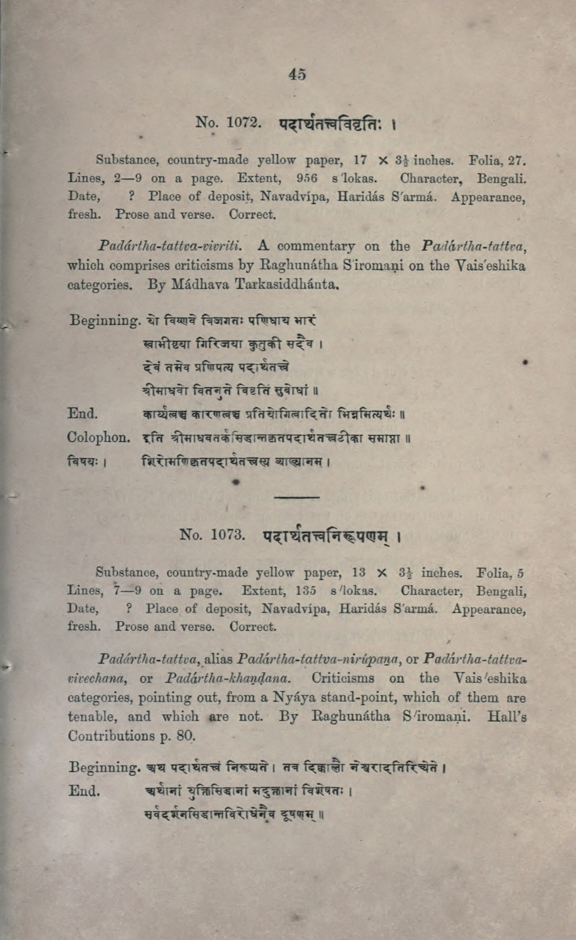 Date, ? Place of deposit, Navadvípa, Haridás S'armá. Appearance,