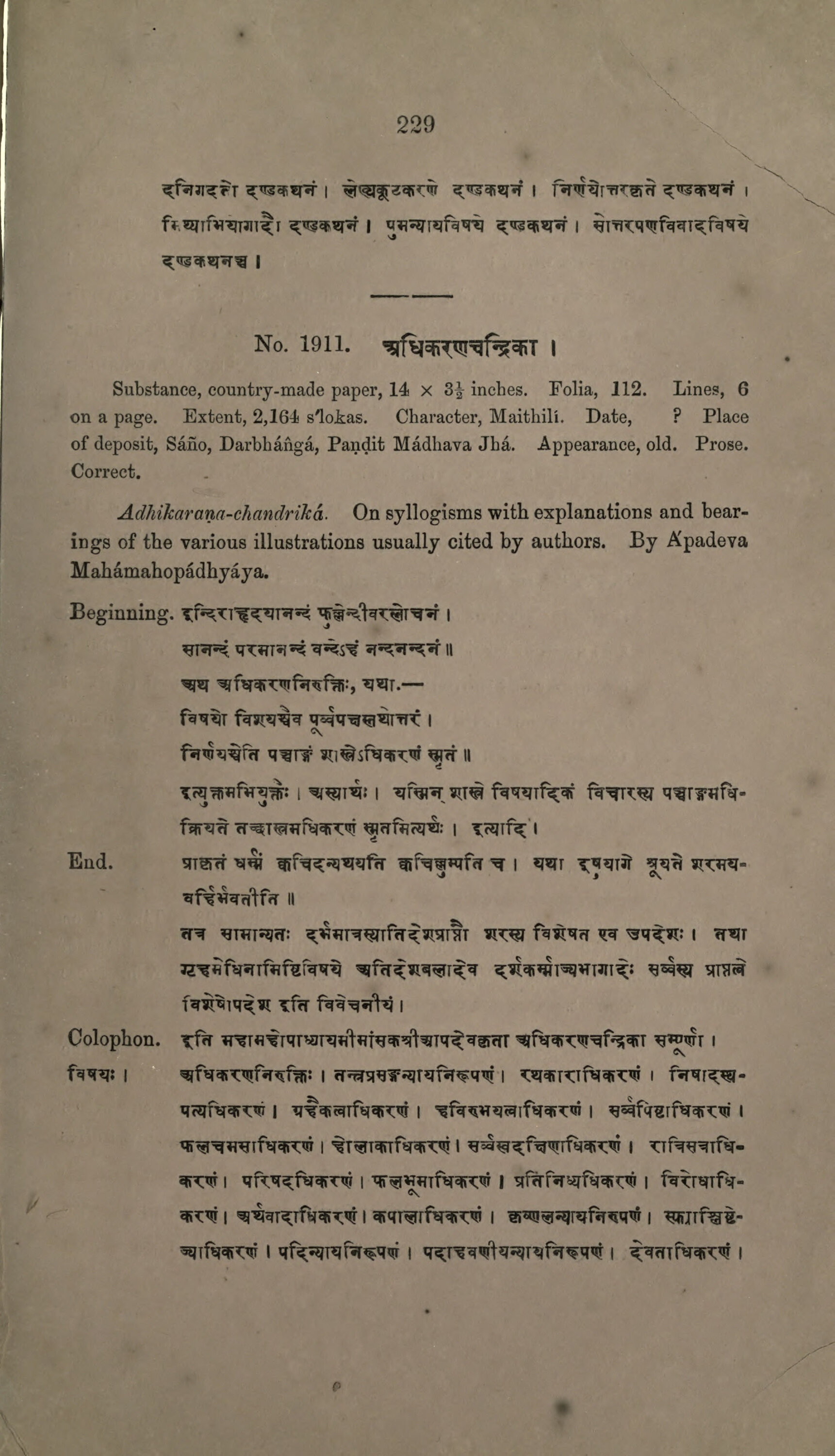 Extent, 2,164 s'lokas. Character, Maithili. Date, ? Place