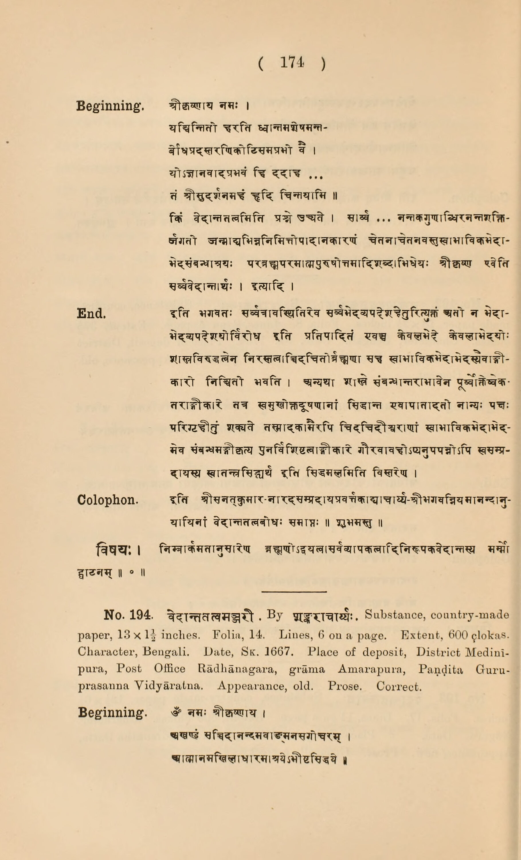 ] No. 194. वेदान्ततत्वमञ्जरी । [vedāntatatvamañjarī | ] By शङ्कराचार्य्यः. [śaṅkarācāryyaḥ. ] Substance, country-made