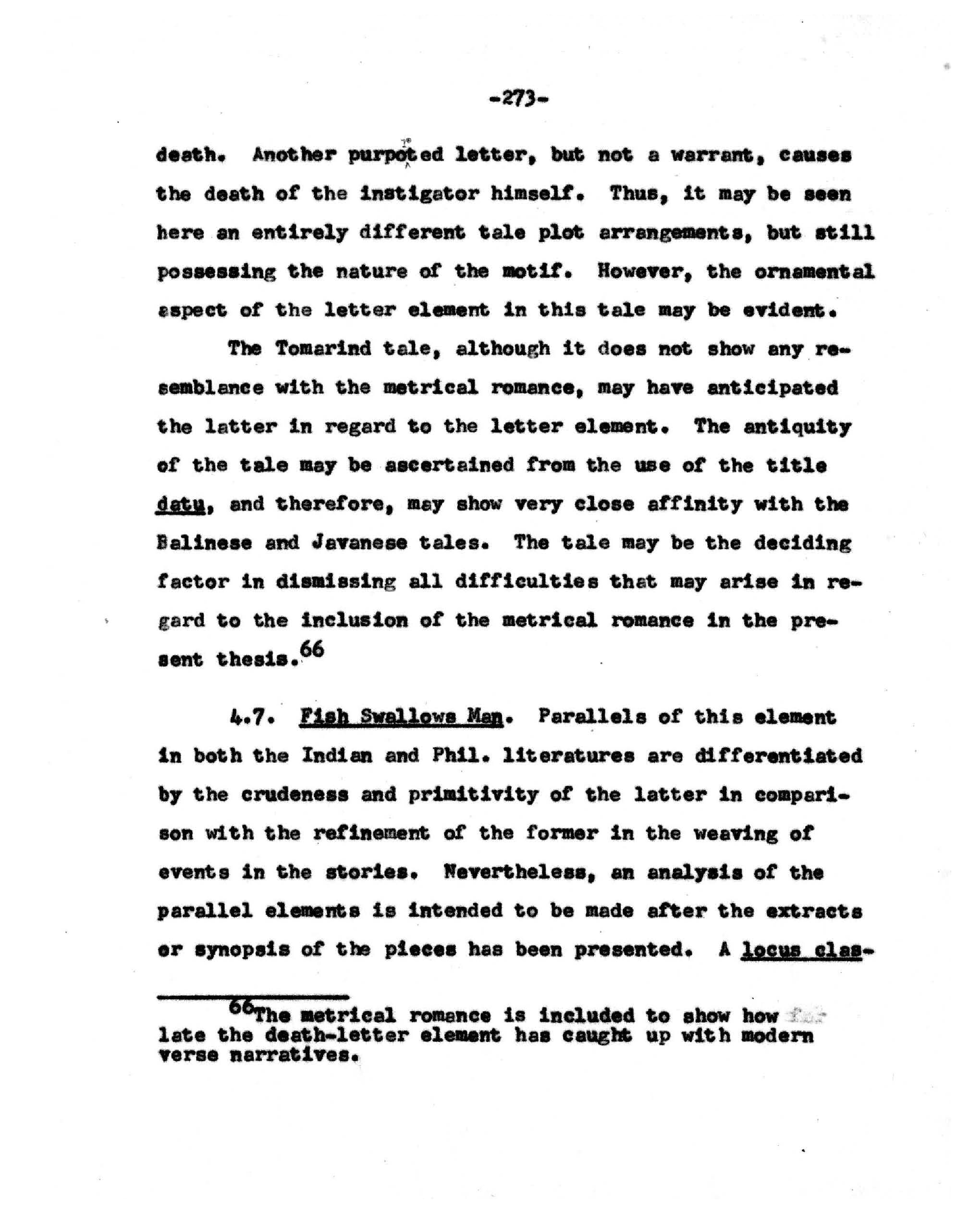 -273- death. Another purpot ed letter, but not a warrant, causes the death of the instigator himself. Thus, it may be seen here an entirely different tale plot arrangements, but still possessing the nature of the motif. However, the ornamental aspect of the letter element in this tale may be evident. The Tomarind tale, although it does not show any re- semblance with the metrical romance, may have anticipated the latter in regard to the letter element. The antiquity of the tale may be ascertained from the use of the title datu, and therefore, may show very close affinity with the Balinese and Javanese tales. The tale may be the deciding factor in dismissing all difficulties that may arise in re- gard to the inclusion of the metrical romance in the pre- sent thesis. 66 4.7. Fish Swallows Man. Parallels of this element