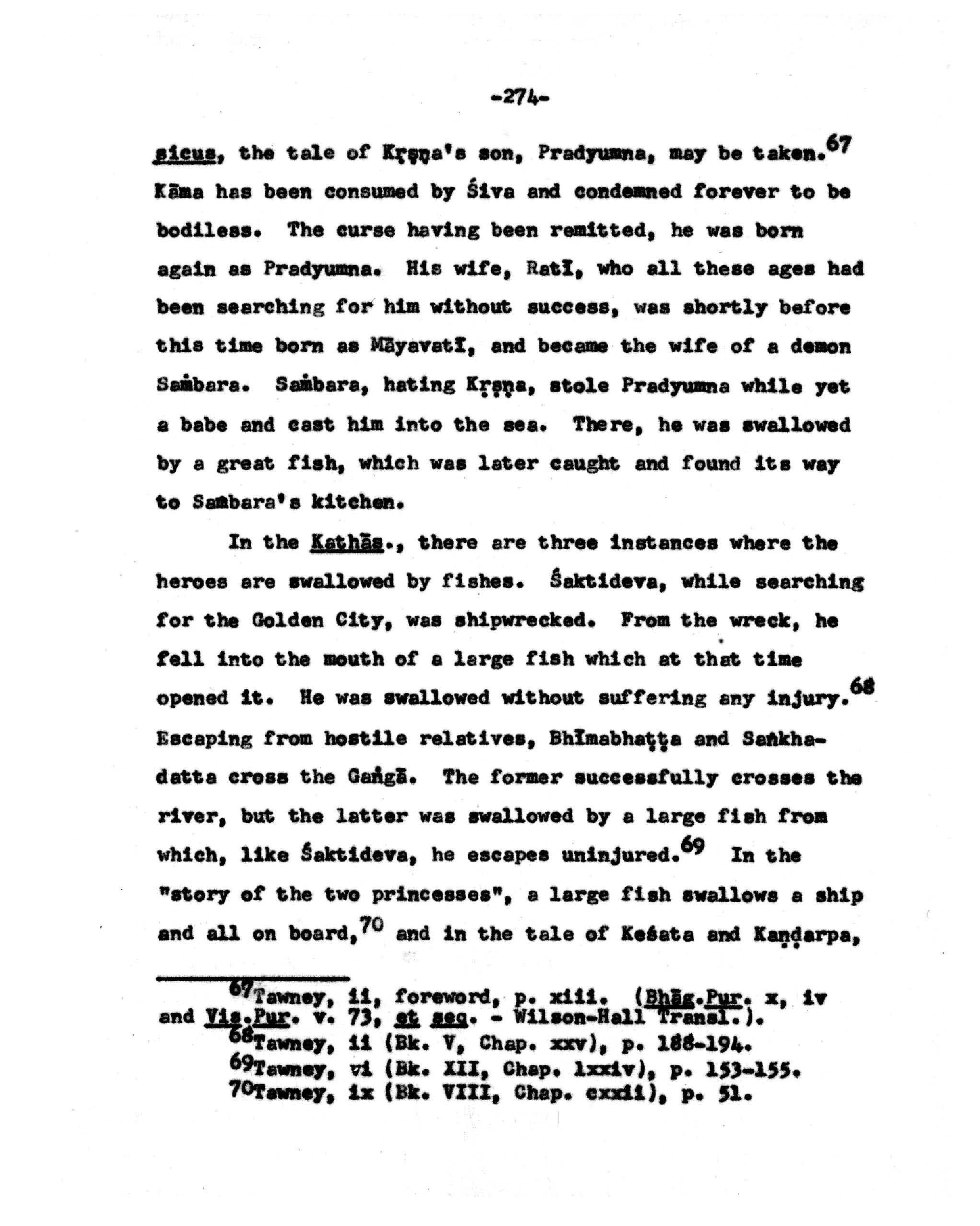 -274- sicus, the tale of Krepa's son, Pradyumna, may be taken. 67 Kāma has been consumed by Śiva and condemned forever to be bodiless. The curse having been remitted, he was born again as Pradyumna. His wife, Rati, who all these ages had been searching for him without success, was shortly before this time born as Mayavati, and became the wife of a demon Sambara. Sambara, hating Kṛṣṇa, stole Pradyumna while yet a babe and cast him into the sea. There, he was swallowed by a great fish, which was later caught and found its way to Sambara's kitchen. In the Kathas., there are three instances where the heroes are swallowed by fishes. Saktideva, while searching for the Golden City, was shipwrecked. From the wreck, he fell into the mouth of a large fish which at that time opened it. He was swallowed without suffering any injury. Escaping from hostile relatives, Bhimabhaṭṭa and Sankha- datta cross the Ganga. The former successfully crosses the river, but the latter was swallowed by a large fish from which, like Śaktideva, he escapes uninjured. 69 In the 68 "story of the two princesses", a large fish swallows a ship
