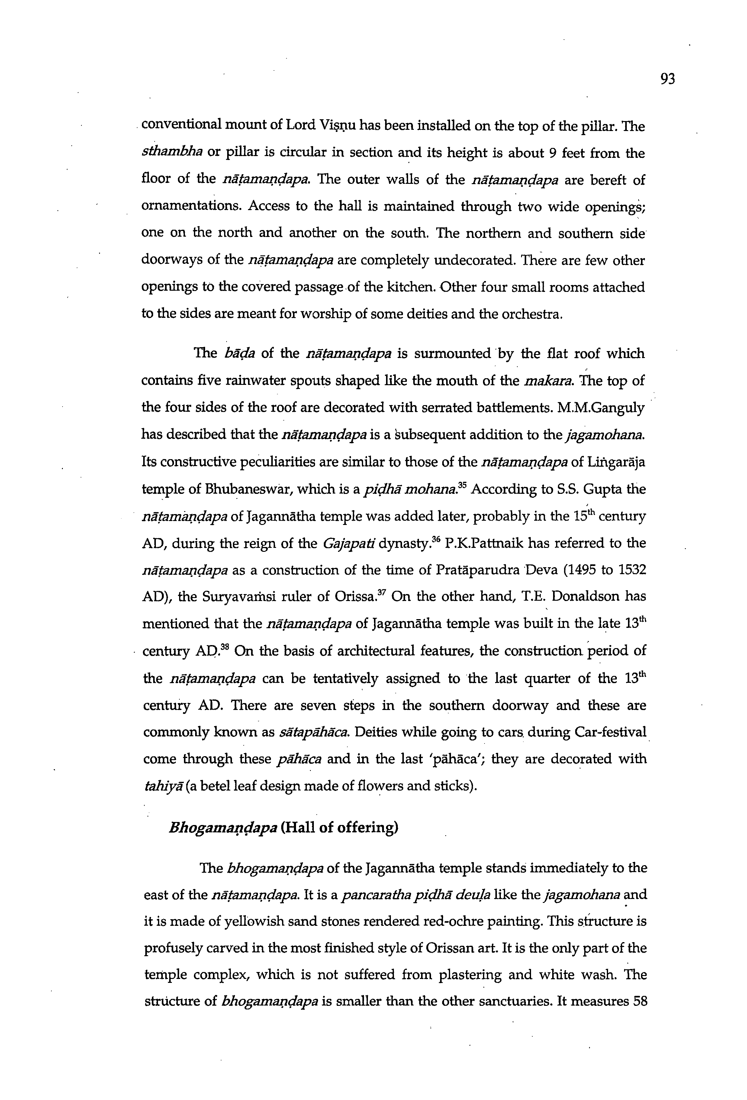 conventional mount of Lord Visṇu has been installed on the top of the pillar. The sthambha or pillar is circular in section and its height is about 9 feet from the floor of the nāṭamaṇḍapa. The outer walls of the naṭamaṇḍapa are bereft of ornamentations. Access to the hall is maintained through two wide openings; one on the north and another on the south. The northern and southern side doorways of the nāṭamaṇḍapa are completely undecorated. There are few other openings to the covered passage of the kitchen. Other four small rooms attached to the sides are meant for worship of some deities and the orchestra. The bāḍa of the nāṭamaṇḍapa is surmounted by the flat roof which contains five rainwater spouts shaped like the mouth of the makara. The top of the four sides of the roof are decorated with serrated battlements. M.M.Ganguly has described that the nāṭamaṇḍapa is a subsequent addition to the jagamohana. Its constructive peculiarities are similar to those of the nāṭamaṇḍapa of Lingaraja temple of Bhubaneswar, which is a piḍhā mohana.35 According to S.S. Gupta the nāṭamaṇḍapa of Jagannātha temple was added later, probably in the 15th century AD, during the reign of the Gajapati dynasty.3 P.K.Pattnaik has referred to the nāṭamaṇḍapa as a construction of the time of Pratāparudra Deva (1495 to 1532 AD), the Suryavaṃsi ruler of Orissa.37 On the other hand, T.E. Donaldson has mentioned that the nāṭamaṇḍapa of Jagannatha temple was built in the late 13th century AD.38 On the basis of architectural features, the construction period of the nāṭamaṇḍapa can be tentatively assigned to the last quarter of the 13th century AD. There are seven steps in the southern doorway and these are commonly known as sātapāhāca. Deities while going to cars during Car-festival come through these pāhāca and in the last 'pāhāca'; they are decorated with tahiyā (a betel leaf design made of flowers and sticks). Bhogamandapa (Hall of offering) The bhogamaṇḍapa of the Jagannātha temple stands immediately to the east of the nāṭamaṇḍapa. It is a pancaratha pidhā deuḷa like the jagamohana and it is made of yellowish sand stones rendered red-ochre painting. This structure is profusely carved in the most finished style of Orissan art. It is the only part of the temple complex, which is not suffered from plastering and white wash. The structure of bhogamaṇḍapa is smaller than the other sanctuaries. It measures 58 93