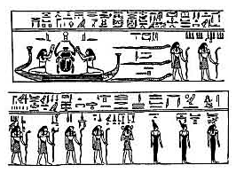 Image right 1: The Boat of Af, the dead Sun-god. (Right) Maati goddesses. Neken-f.