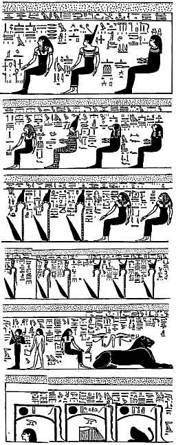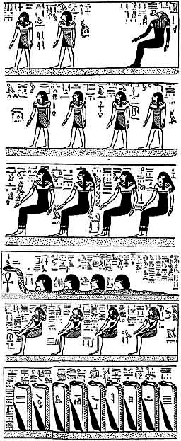 9-12. Four goddesses, each in a seated position, but without a throne; the first is called ANTHETH, the second HENHENITH, the third HEMT, and the fourth SEHITH.